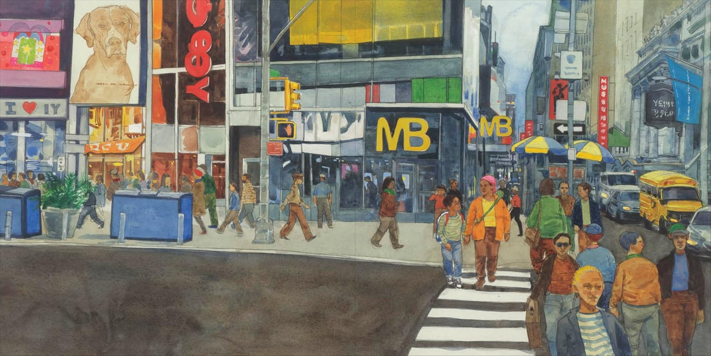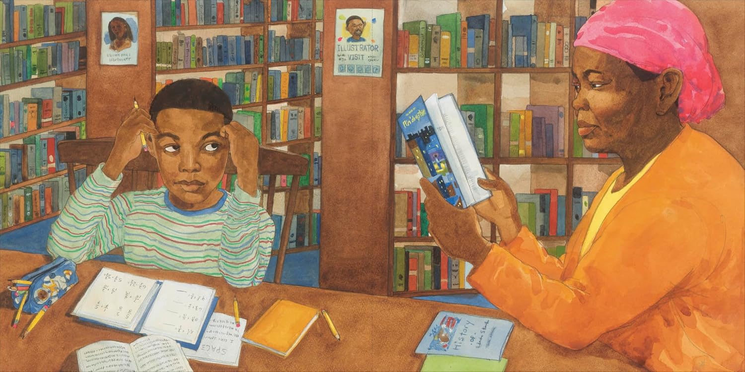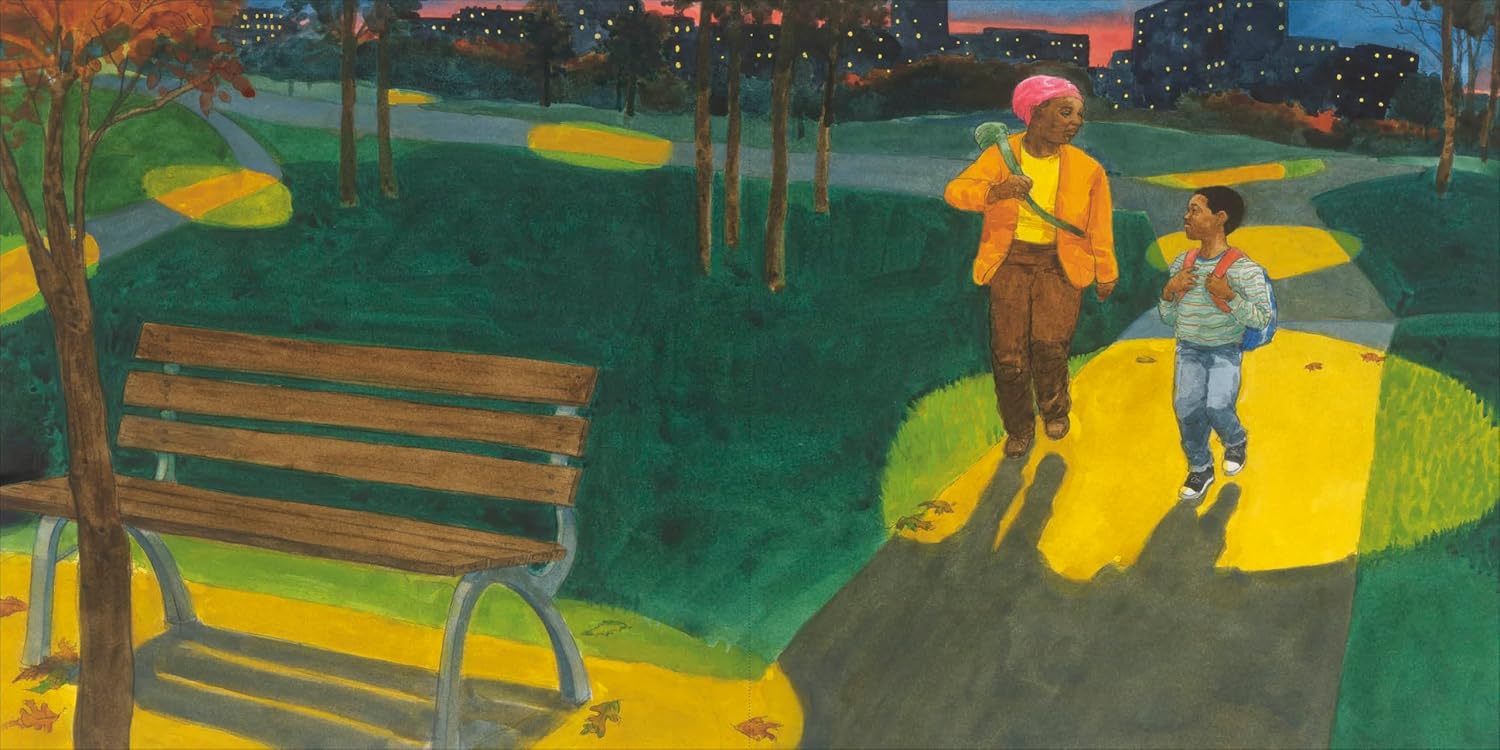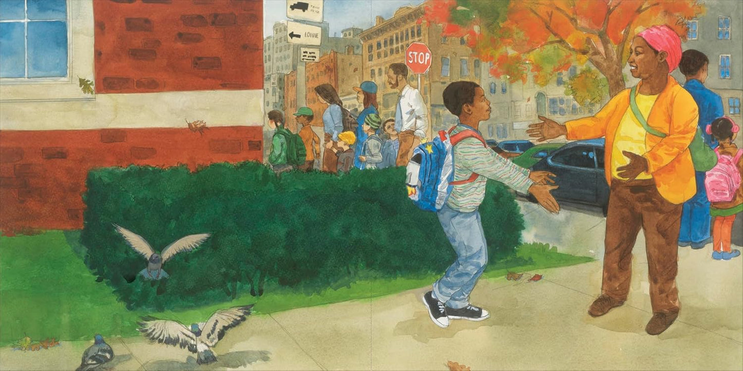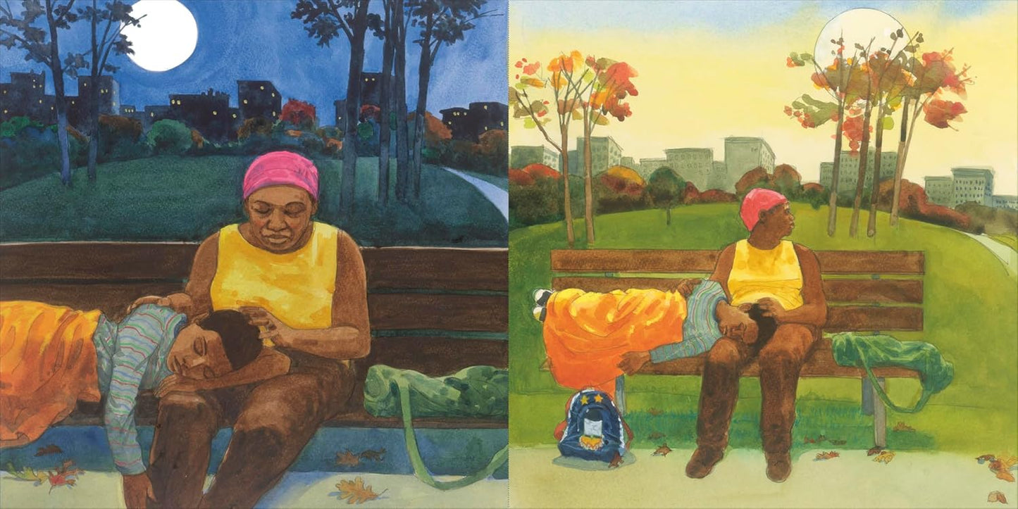 Through the lens of Ransome's evocative illustrations we see that they ate out because they don't have a kitchen to cook in. They went to the library because they don't have a quiet space to do homework. And at night, they settle in to sleep on a bench in a city park because they don't have a home. The next morning, they are awakened by the rising sun, Mom's bag is full of clean clothes, and there's a fountain for washing up--and finally they are ready for the walk to school. His classmates may or may not know about his living situation, but what shines throughout the story is the deep love he and his mom have for each other.