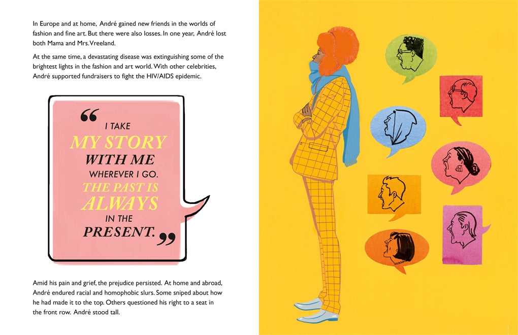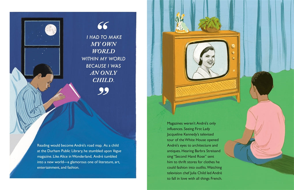 Growing up in the Jim Crow South wasn't easy for young André. He escaped into the glimmering worlds he discovered inside magazines like Ebony and Vogue. He fell in love with all things French, and honed his taste for elegance and style in spite of those who judged and bullied him. Standing tall against all odds, André spun his hardships into a fashion fairytale of his own making.