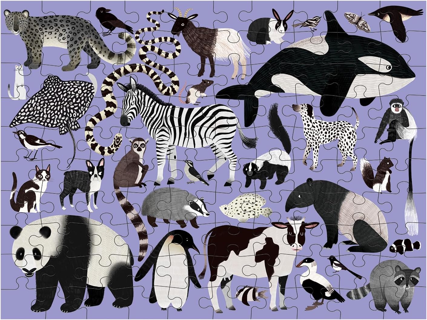 TWO PUZZLES IN ONE: Colorful and educational, the double-sided puzzle features charming illustrations of the world's most colorful animals on one side and black and white animals on the other. One side is glossy and the other is matte for easy sorting.