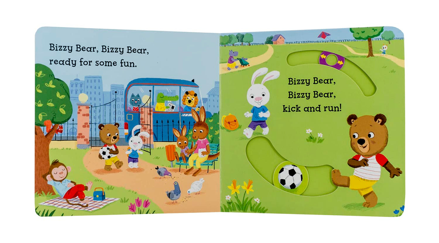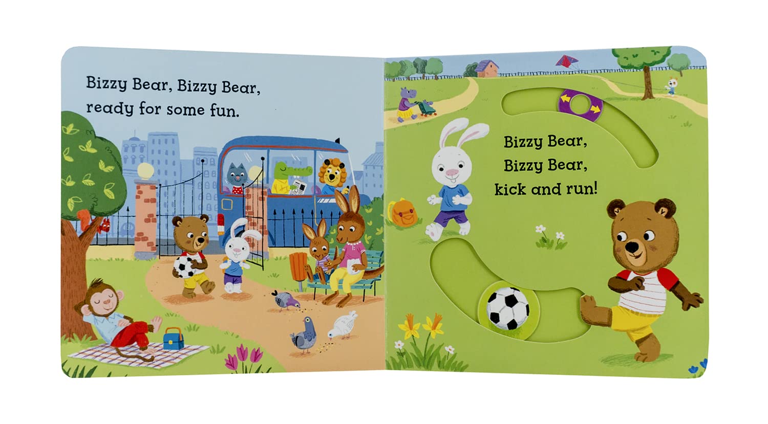 With chunky sliders to push and pull, these robust little board books are perfect for active toddlers. Rich in visual detail and with touches of humor, they are set to become firm favorites in the family library. Bizzy Bear has a lot going on today! He calls his friend Rabbit and invites him to the park, where they play soccer, have fun on the slide and the seesaw, and even have time for a bike ride and an ice cream!