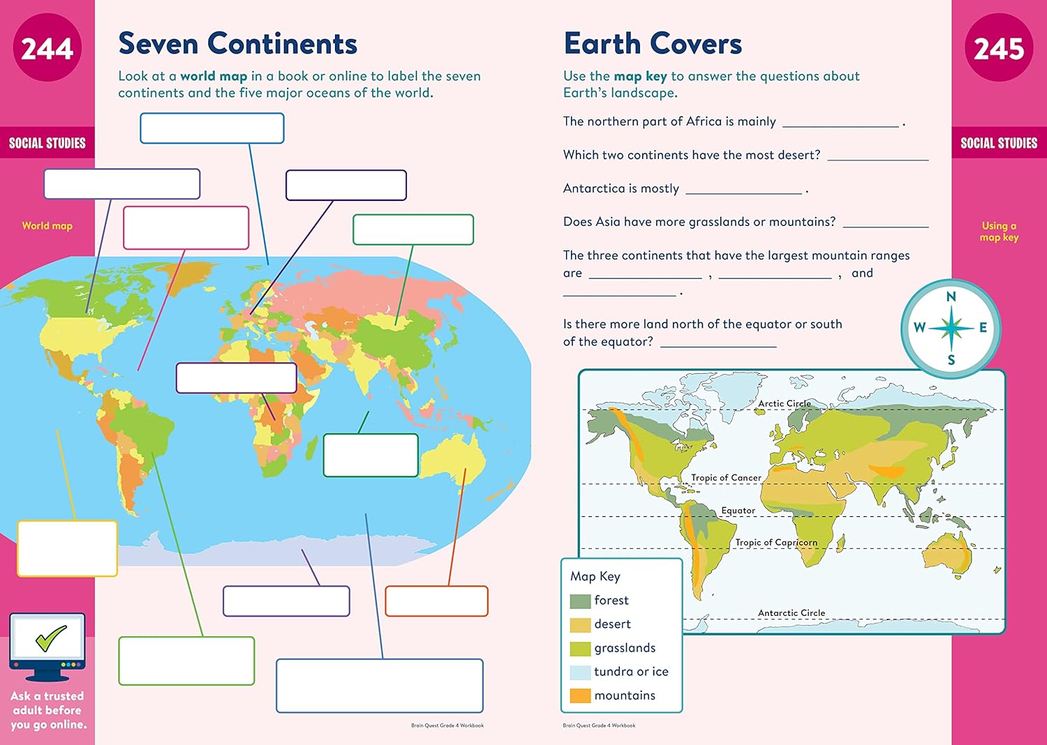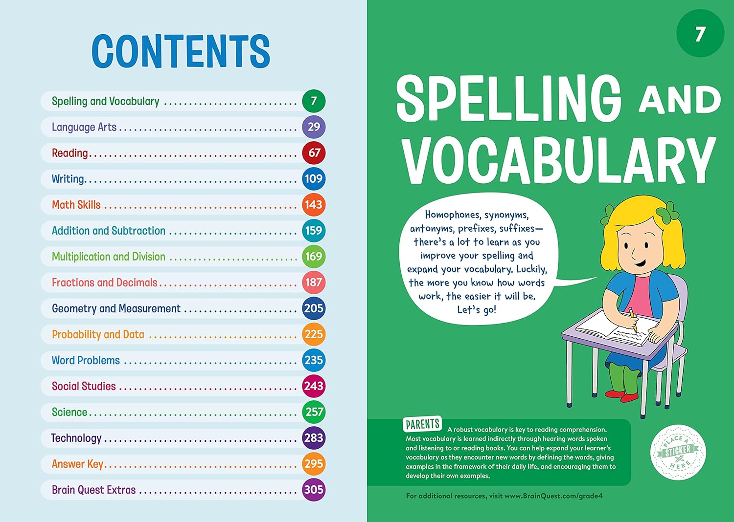 Loved by kids, teacher approved, and trusted by parents, Brain Quest Grade 4 Workbook reviews and reinforces what children are learning in the classroom in an instantly engaging, entertaining way. Each page is jam packed with fun activities, practice exercises, and games covering vocabulary, language arts, math word problems, multiplication and division, fractions and decimals, geometry and measurement social studies, science, and much more.
