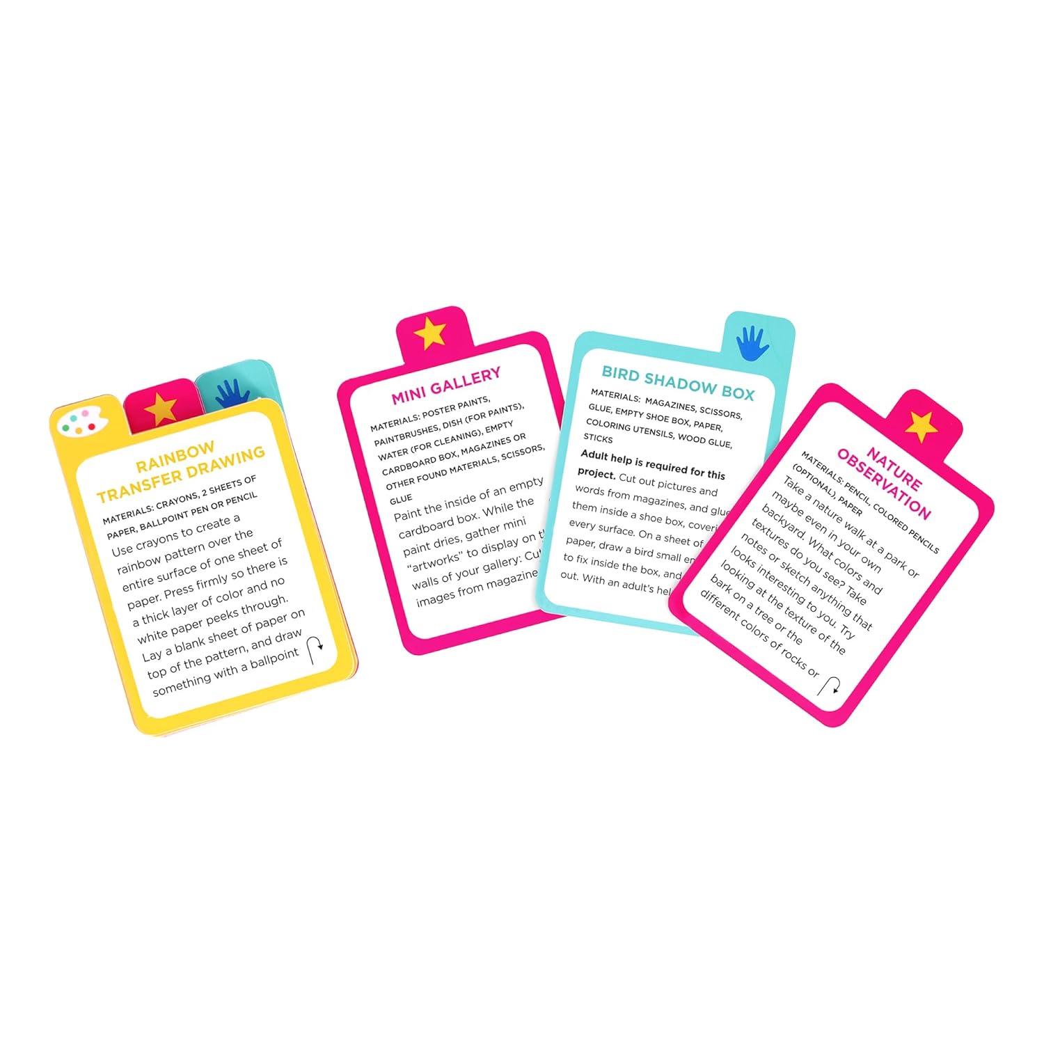From everyday objects and speedy sketches to triptychs and shape-scapes, this pack includes 50 fun ideas to inspire play that will keep boredom at bay. You’ll find crafts that kids can achieve independently as well as activities you can do together, so there’s something for every scenario. How about creating a blob painting? Or giving surrealism a try? Maybe make a foil sculpture? You can even go on an art hunt around your town! Choose cards with the palette icon if you’re feeling playful, the star icon if you want to be inspired, or the hand icon if you’re in the mood to make. With so many options, you can pick more than once to find the activity that fits how you feel in the moment!
