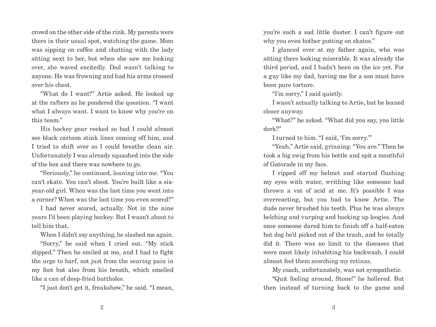 Will is a Canadian eighth grader who hates hockey--and he stinks at it, too. Will is bullied at school, doesn't have any friends, and is generally miserable.