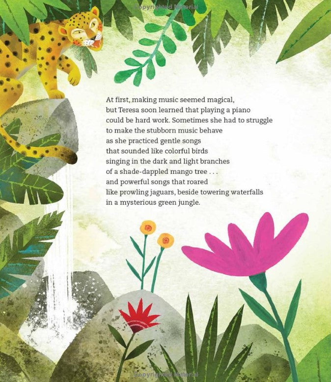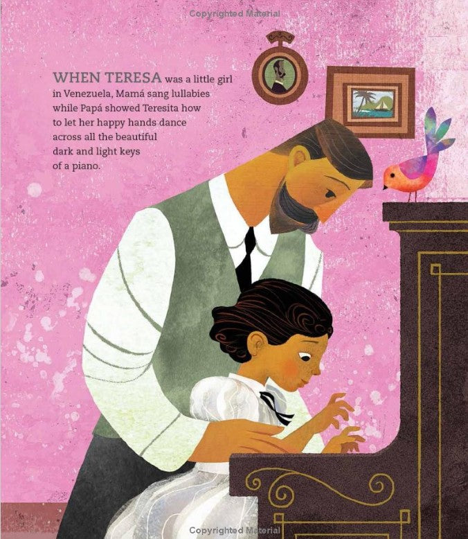 As a little girl, Teresa Carreño loved to let her hands dance across the beautiful keys of the piano. If she felt sad, music cheered her up, and when she was happy, the piano helped her share that joy. Soon she was writing her own songs and performing in grand cathedrals. Then a revolution in Venezuela forced her family to flee to the United States. Teresa felt lonely in this unfamiliar place, where few of the people she met spoke Spanish. Worst of all, there was fighting in her new home, too--the Civil War.