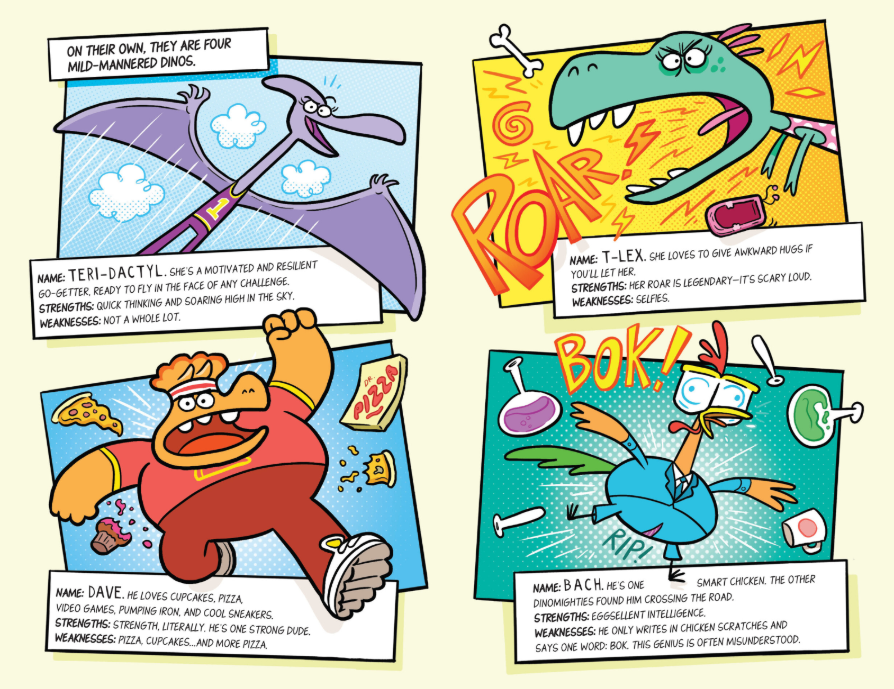 On their own, they are four mild-mannered dinos, but together they are . . . DINOMIGHTY!