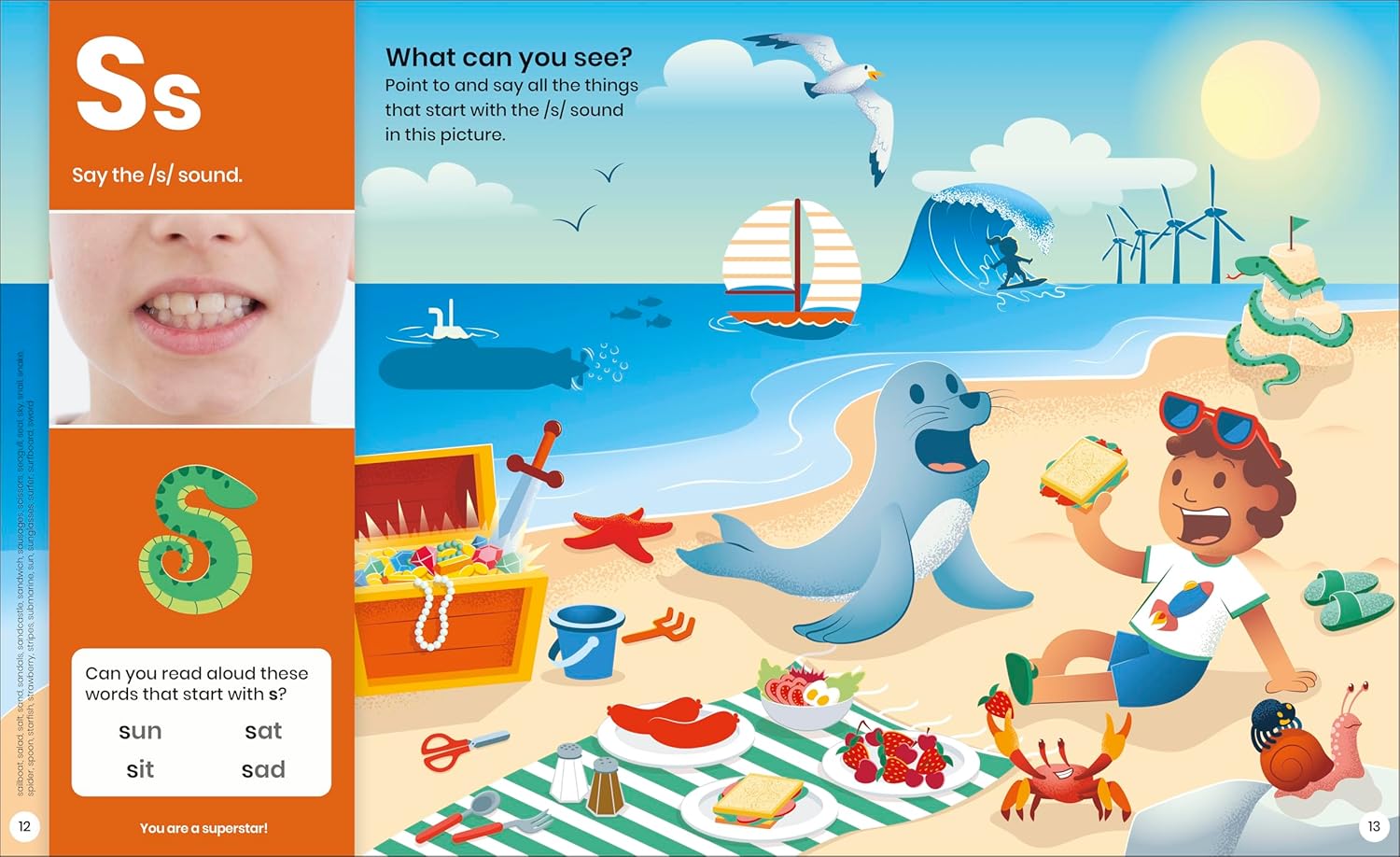 Each page is packed full of fun illustrations of words that include the target sound for children to point to and sound out. Mouth placement photos help guide pronunciation and handy illustrated mnemonics-such as an s-shaped snake for s-help children remember the letter shapes and their corresponding sounds. Decodable or easy-to-read words are also included in word banks for children to practice blending sounds and reading aloud, and to help boost their spelling and vocabulary.