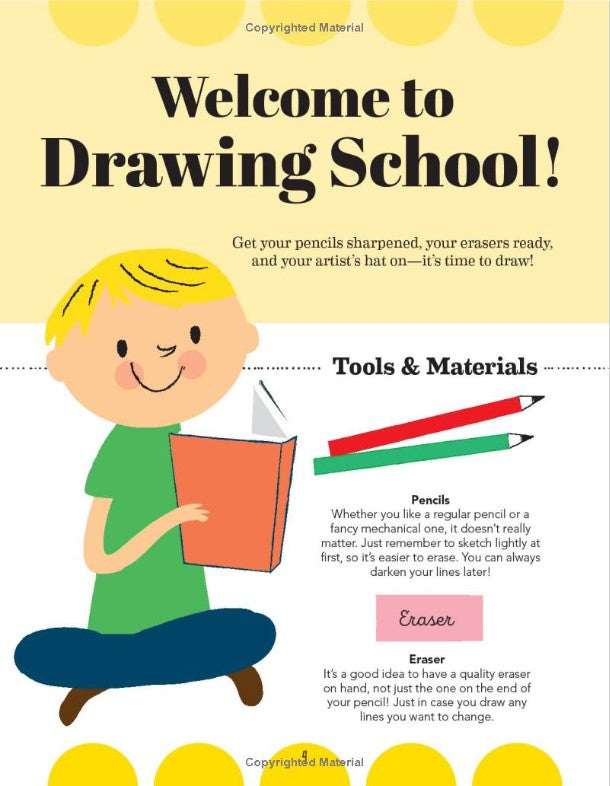 Love of art and drawing can start young in children. Nurture your child's connection to the blank page with Drawing School! This comprehensive art guide is designed to ensure that anyone can learn how to draw with the simple step-by-step projects! This art book begins with instructions for drawing basic shapes and an introduction to basic tools and materials, then jumps directly into drawing projects on a variety of subjects, from things found on the farm, under the sea, and in the garden to around the house, around town, and around the world.