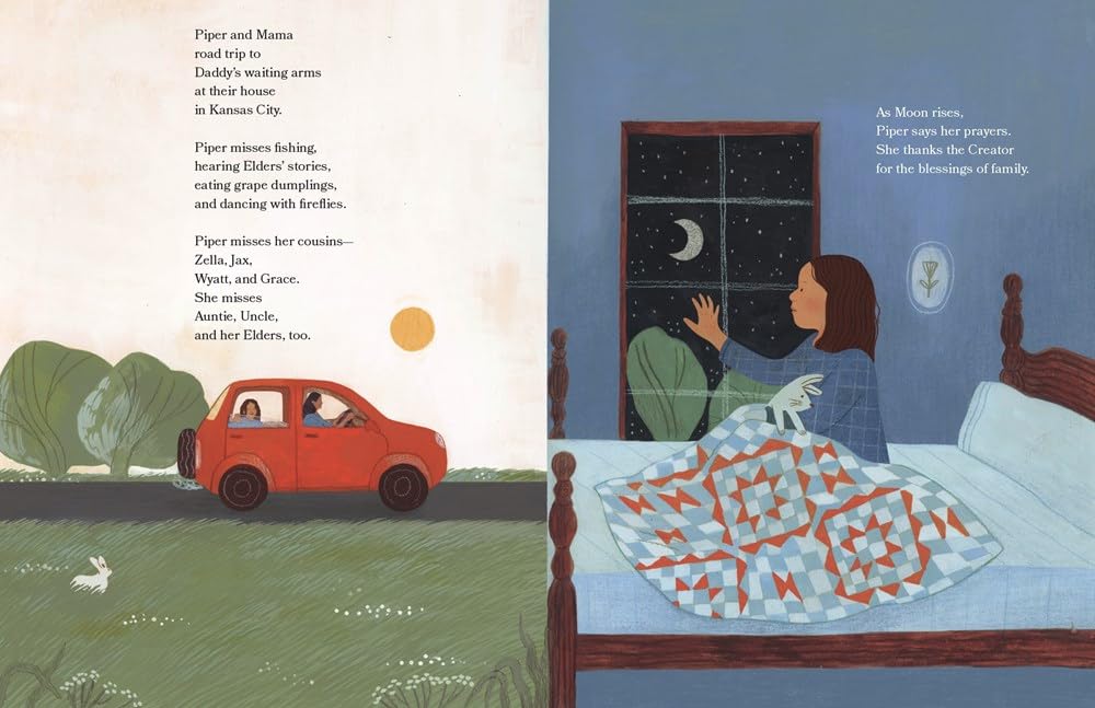 Piper feels grateful for visits with her relatives, especially for the time spent with her cousins in Cherokee Nation and Muscogee Nation during summer vacations, fishing on misty mornings and playing on firefly-filled evenings. Piper's family lives a road trip away in Kansas City. So when a neighbor named Sumi moves in next door, Piper is excited to share her stories and seasons with a new friend.
