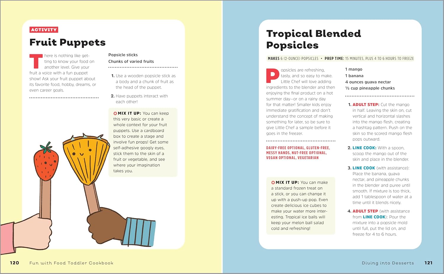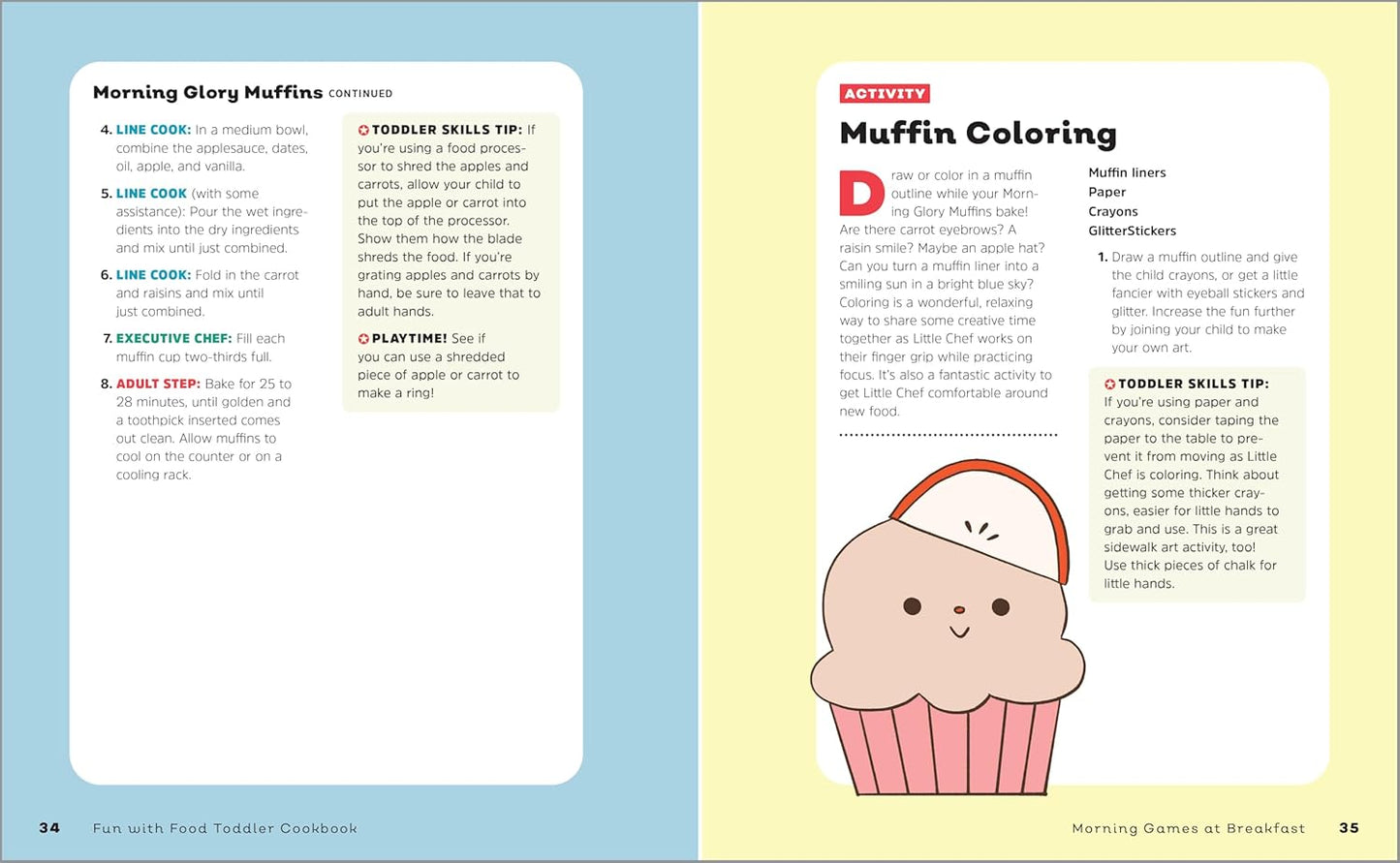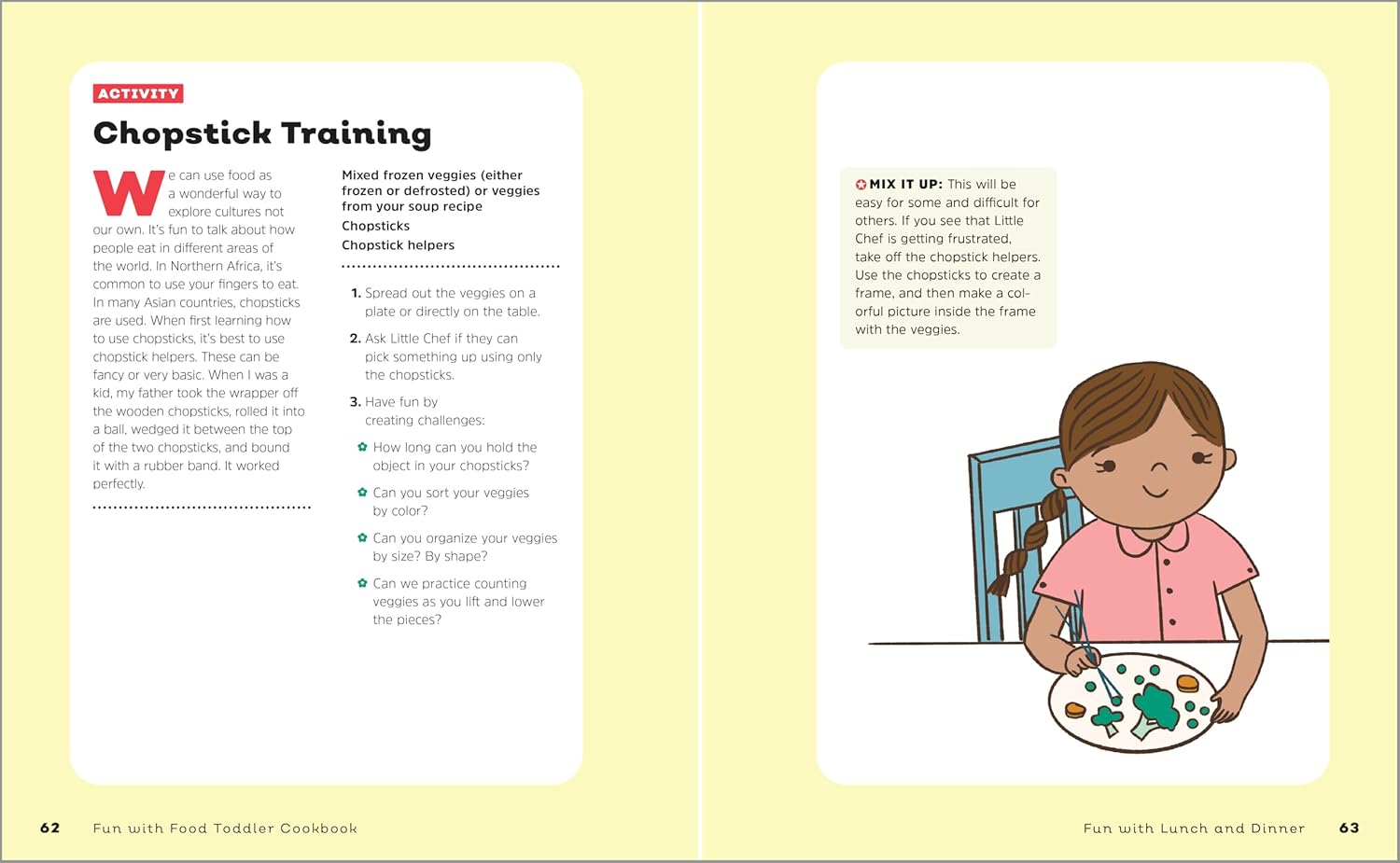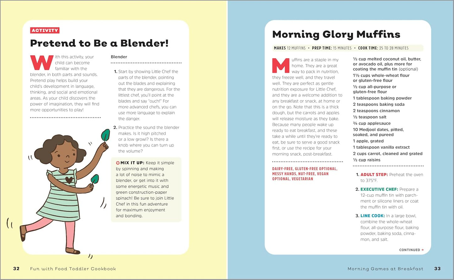 - Chances to play-Teach your child to have fun outside the kitchen as they dig into tons of awesome food-related activities in this toddler cookbook.