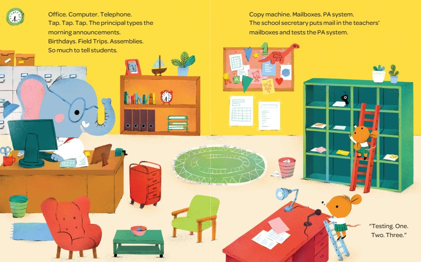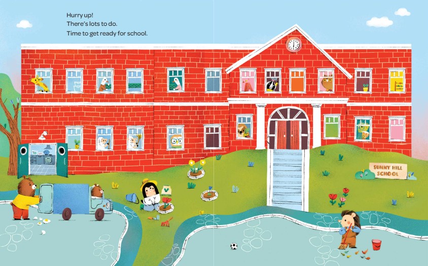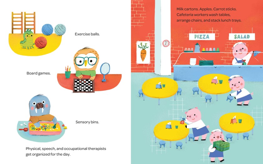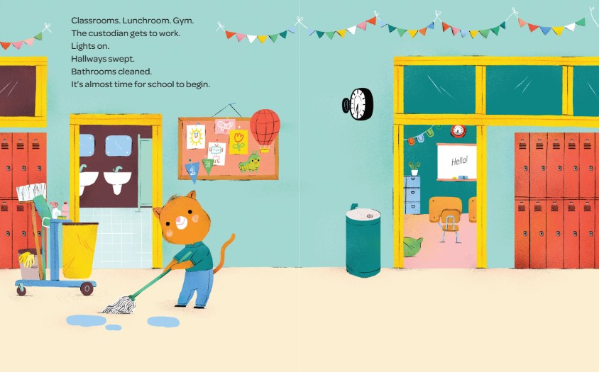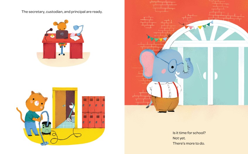 The custodian turns on the lights and sweeps the hallways. Is it time for school? Not yet! The cafeteria workers wash tables and stack lunch trays. Is it time for school? Not yet! Teachers unpack supplies and organize their classrooms. Is it time for school? Almost! The students are on their way, on foot, on bicycles, and in cars and buses. Welcome, everyone!
