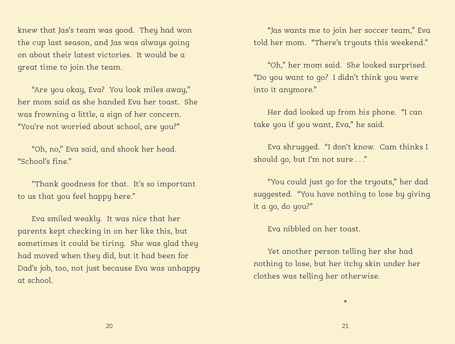 Eva is a stand out playing soccer during recess at school. So her friends can't understand why she won't join them in playing for their local team. Eva is afraid to share her secret -- at her last school, she was bullied because of a painful skin condition, She doesn't want it to happen again, and her instinct is to hide away. Can Eva find the courage to take to the field and play the game she loves?