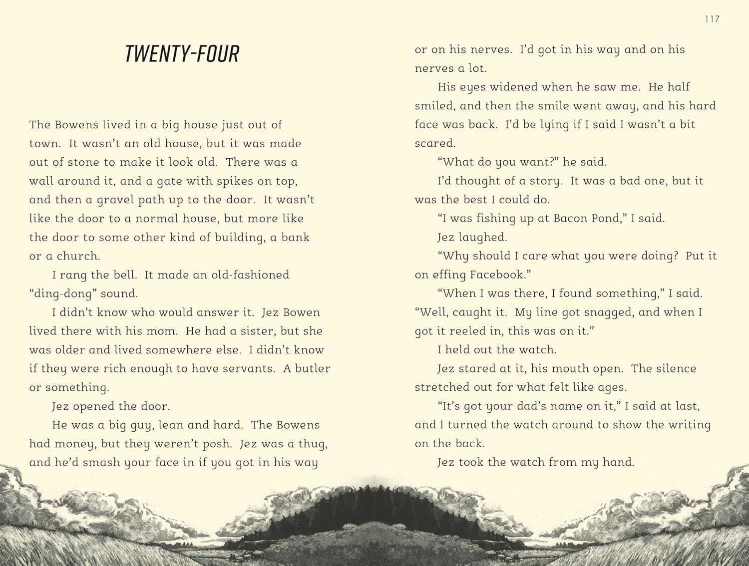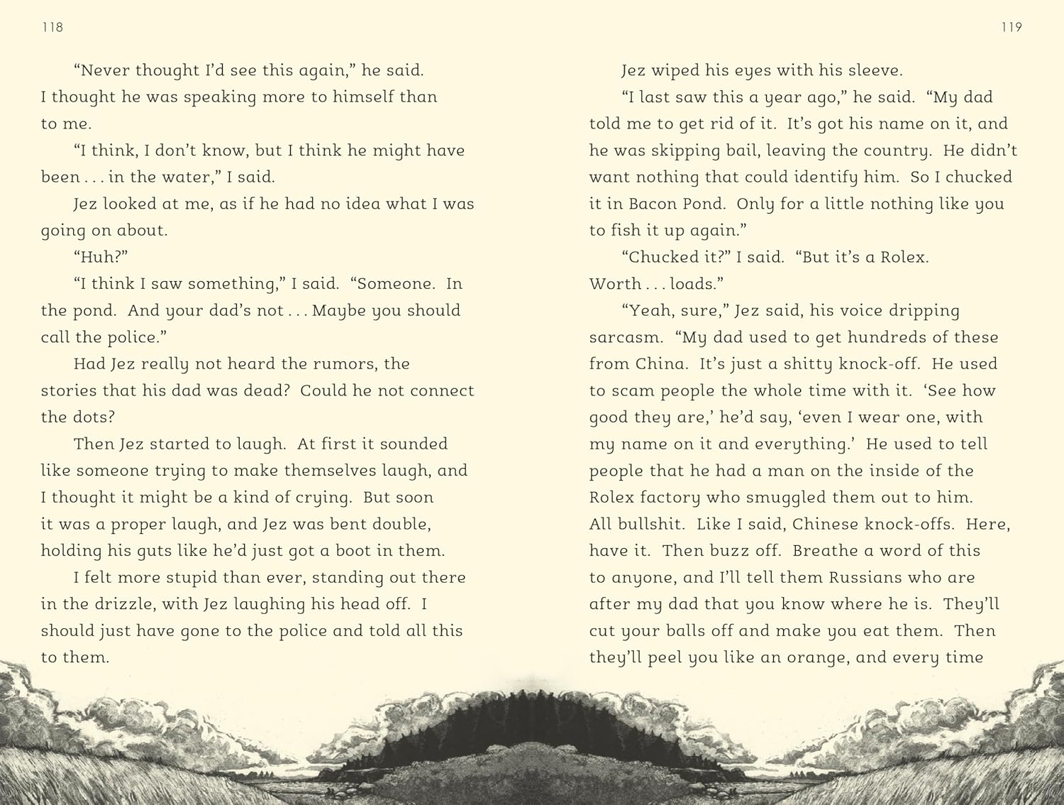 When Kenny and Nicky spot a glint of gold in the murky waters of Bacon Pond, they can't leave it alone. It means money, and money helps patch things up when you haven't got any. But sometimes it's better not to look too deep. Not when there are local gangsters involved, and tough questions about your own family's past. But Nicky can't help looking back. He knows it's a bad idea, and it could ruin everything. Can he save himself and his family, or will the secrets of the lake take them all down?