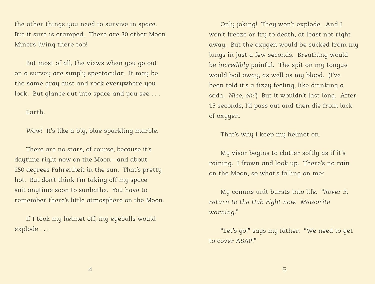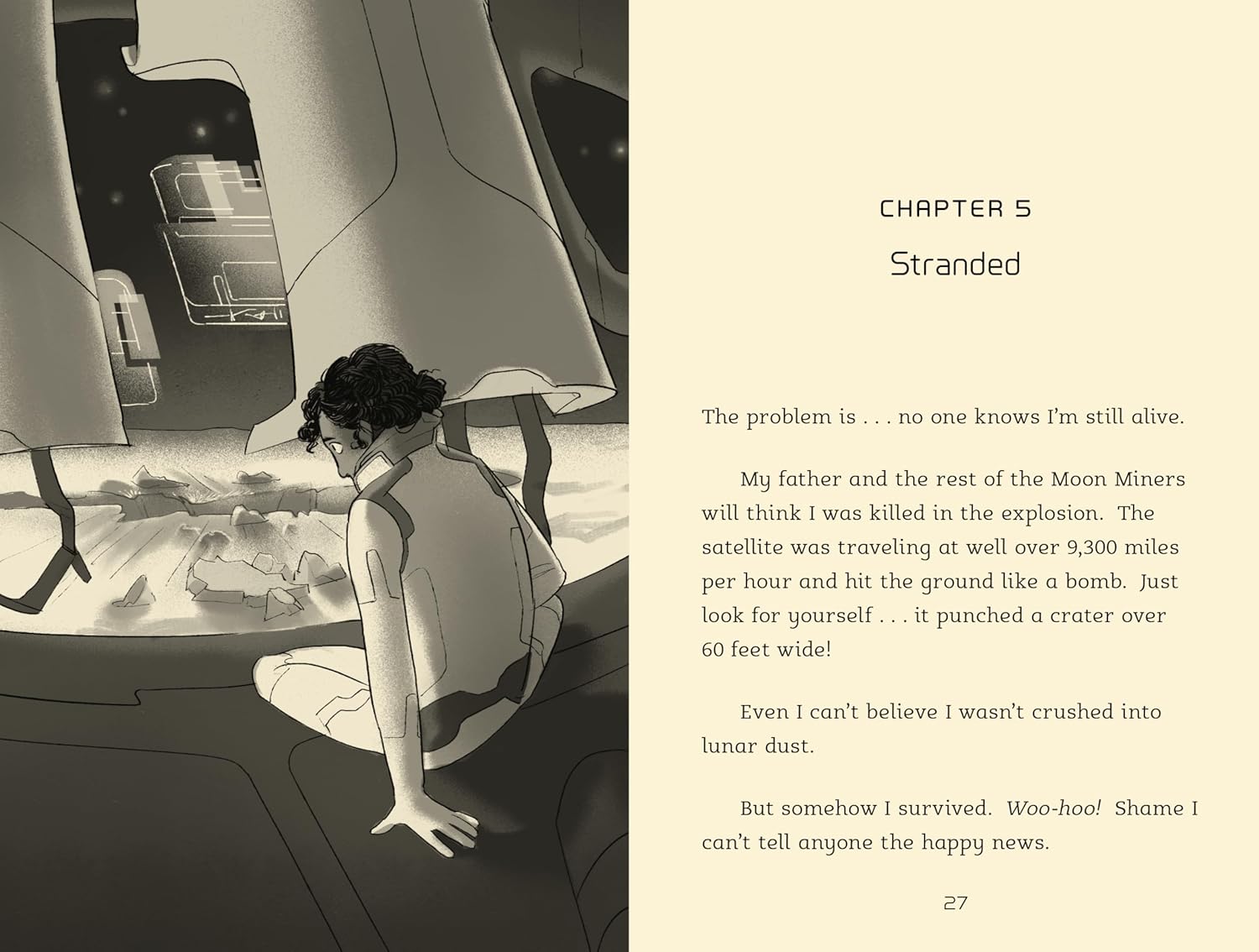 Luna loves living on the moon. She enjoys helping her father--a Moon Miner--on his search for precious minerals and rocks. But when a devastating meteor strike destroys their base, Luna is left stranded alone on the moon. With no shelter and few supplies, she must find a way to survive. The problem is--any hope of rescue is at least three days and 250,000 miles away . . . and her oxygen is running out fast!