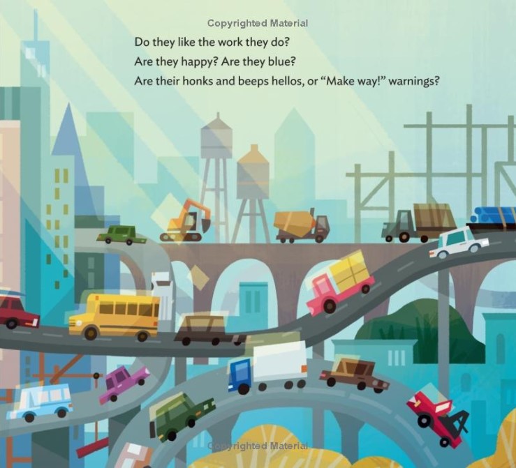Do diggers wish they were as big as an excavator or are they happy with the holes they can dig? Do trains get tired of staying on the same track or do they welcome all the passengers aboard? Bright and lively illustrations bring each vehicle to life."