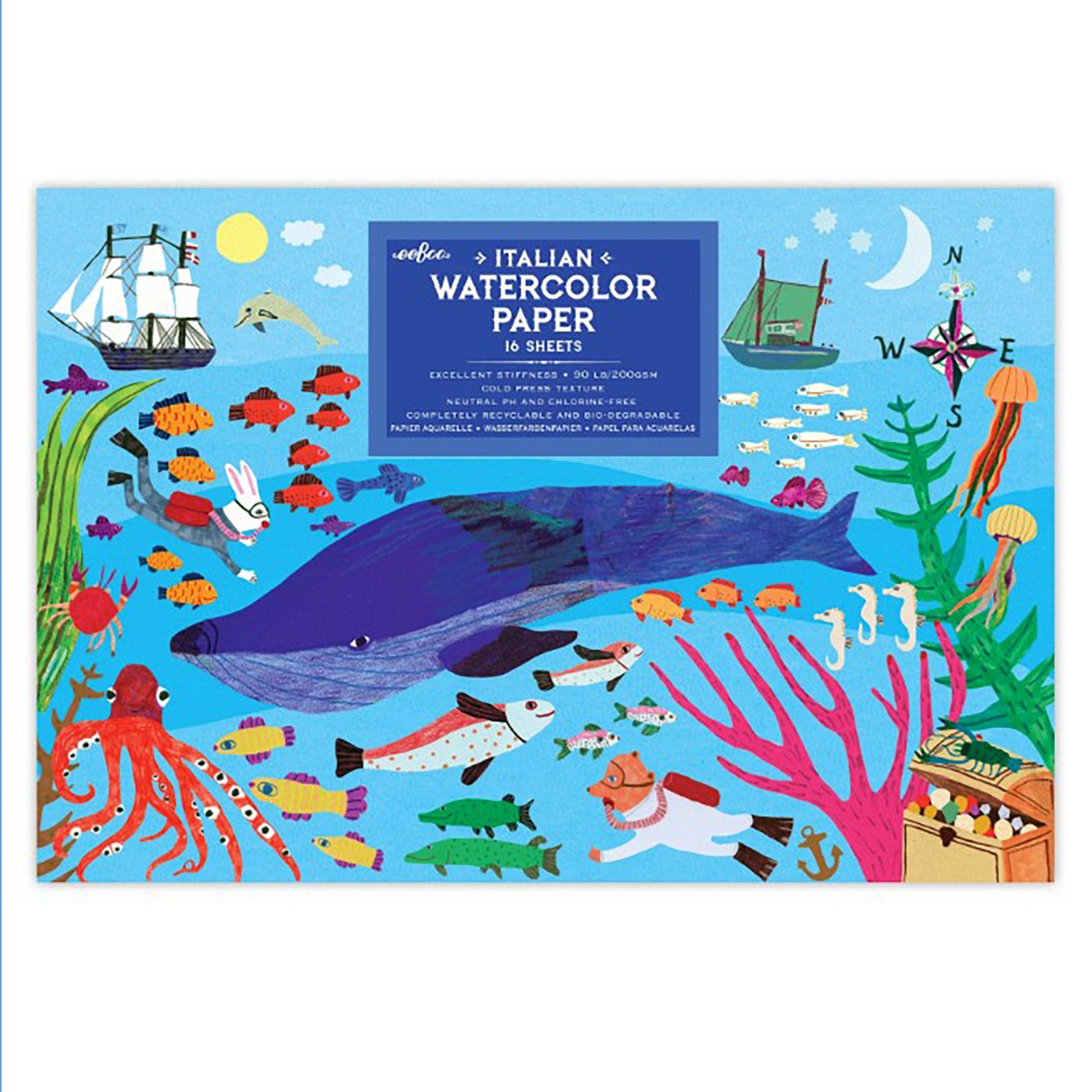 Watercolor pad featuring a charming oceanic theme. This high-quality, Italian watercolor paper is the perfect companion to our In the Sea Watercolor Tin. This extra thick and absorbent paper makes painting with watercolors easy. Glue bound for easy removal of pages. It's time to paint your masterpiece!
