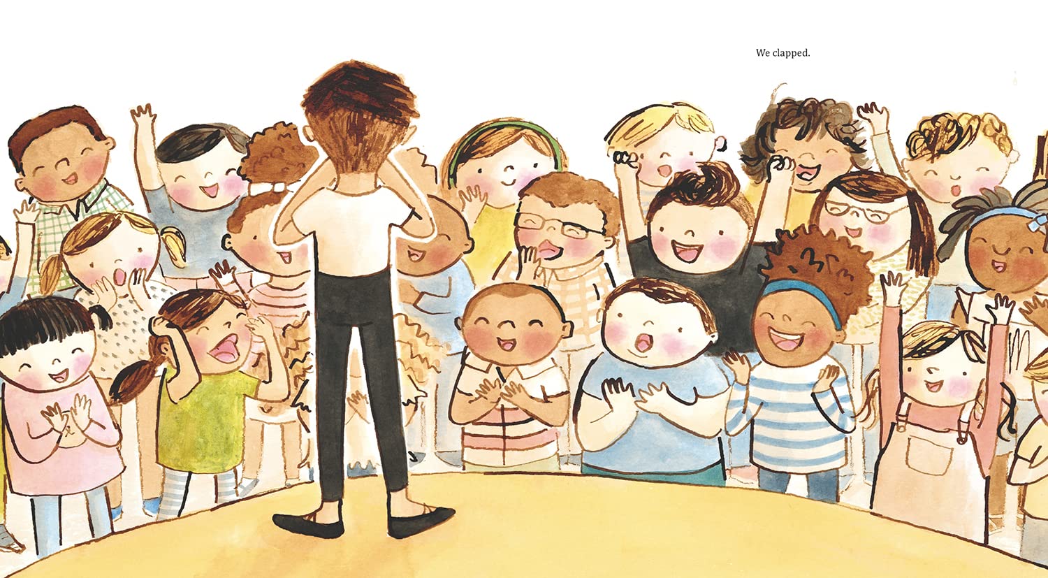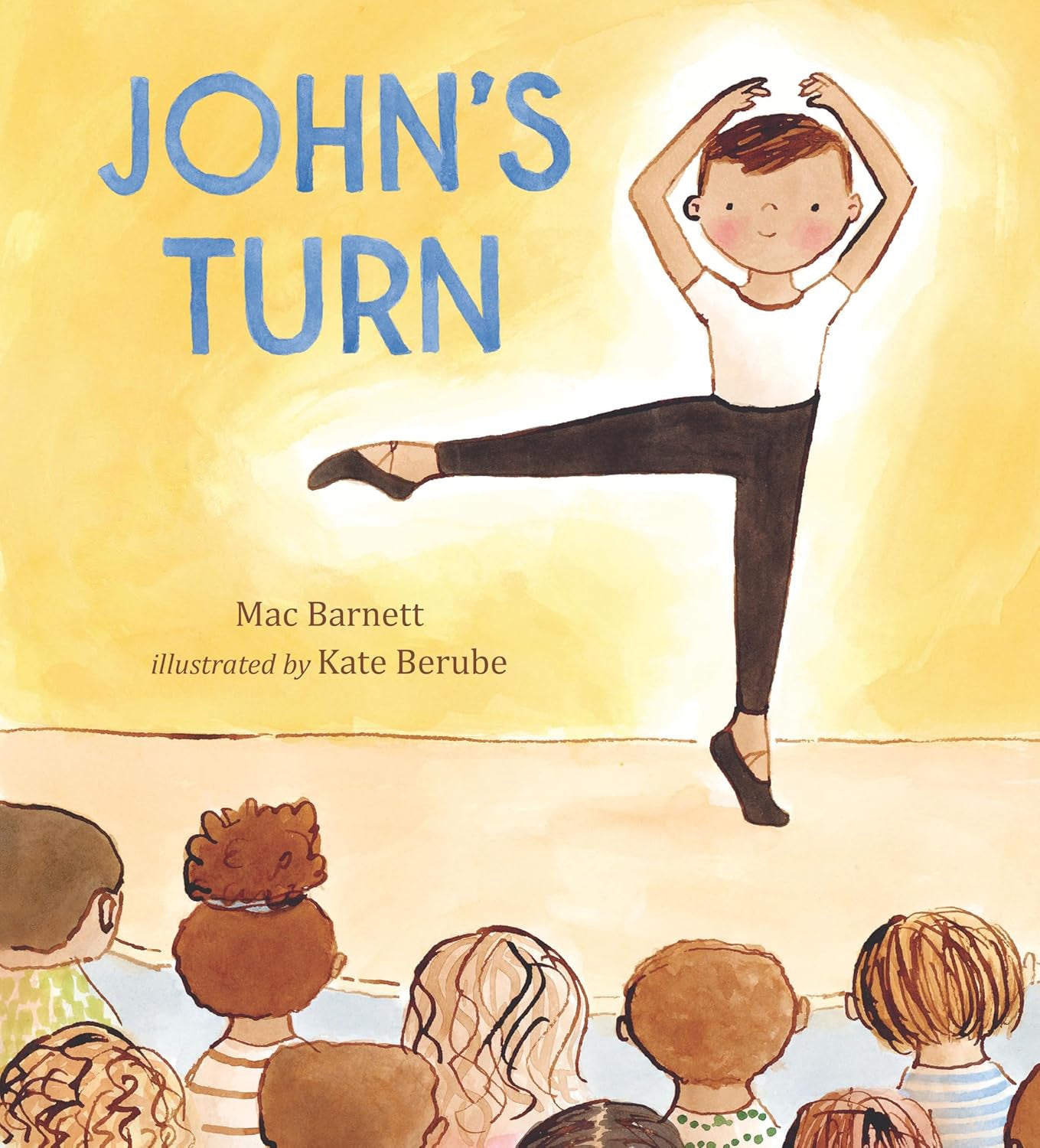 It's John's big day at school today--a performance for Sharing Gifts time. His bag is carefully packed and prepared, his classmates are ready, and the curtain is waiting to open. John is nervous, looking out at all the other children staring back at him. But he takes a big breath and begins. Mac Barnett's compassionate text and Kate Berube's understated and expressive art tell the story of a kid who finds the courage to show others his talent for dancing.