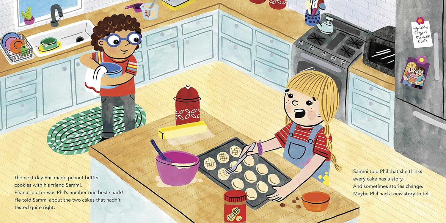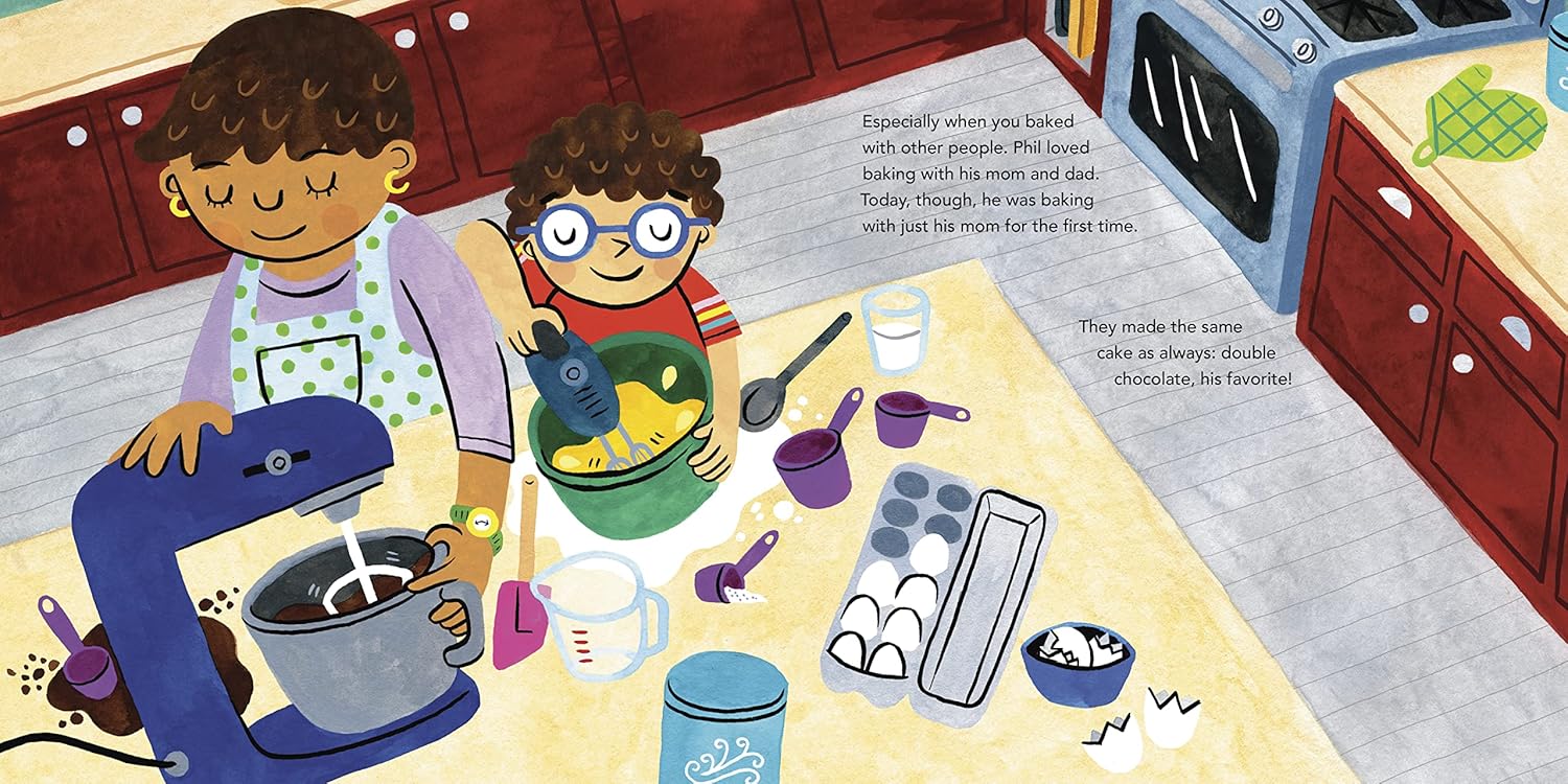 Soon, Phil is on a mission to make a cake that fits his new life, incorporating some of his parents' favorite ingredients along with his own. In this comforting and sweet tale about moving forward after a big life change, trying something new is just the right recipe.