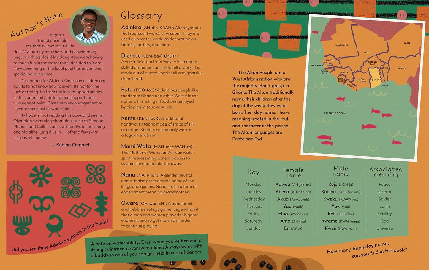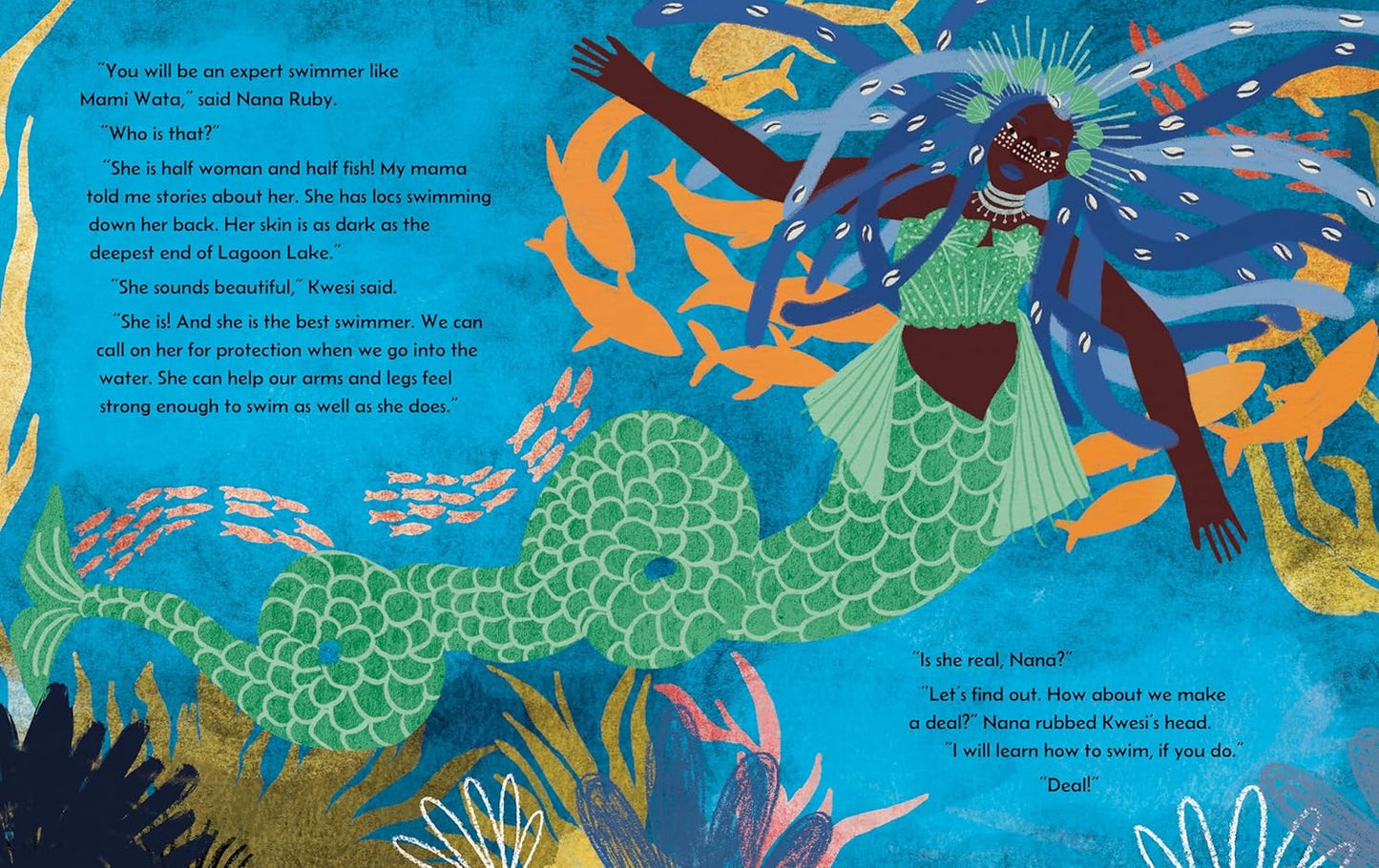 "So I will never learn how to swim?" Kwesi asks. But Nana Ruby tells him they will call on the strength of Mami Wata, the sea creature of West African legend, to conquer their fears together. This touching intergenerational story teaches the importance of naming, acknowledging and facing fears.