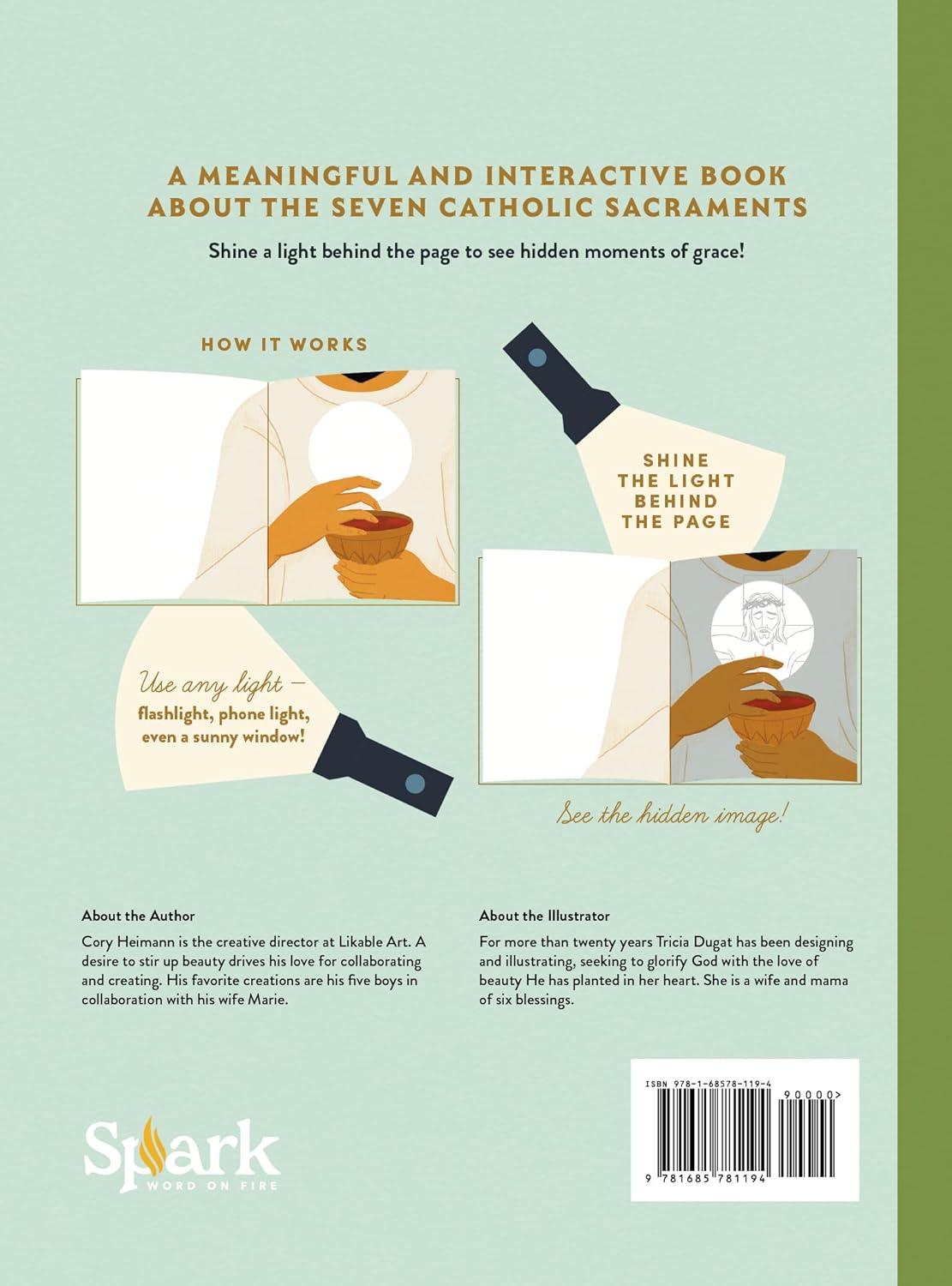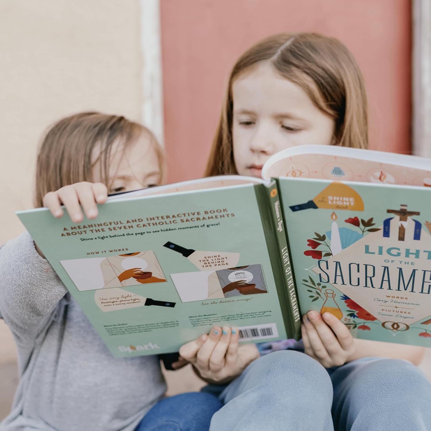 Light of the Sacraments is an interactive book for readers ages 4-12 about each of the seven Catholic sacraments. It pairs meaningful (and fun!) rhymes with Scripture verses to explain the sacraments, and features engaging illustrations and hidden images that are revealed by shining a light on the back of the page. These "hidden" moments reveal truths about the invisible grace of the sacraments.