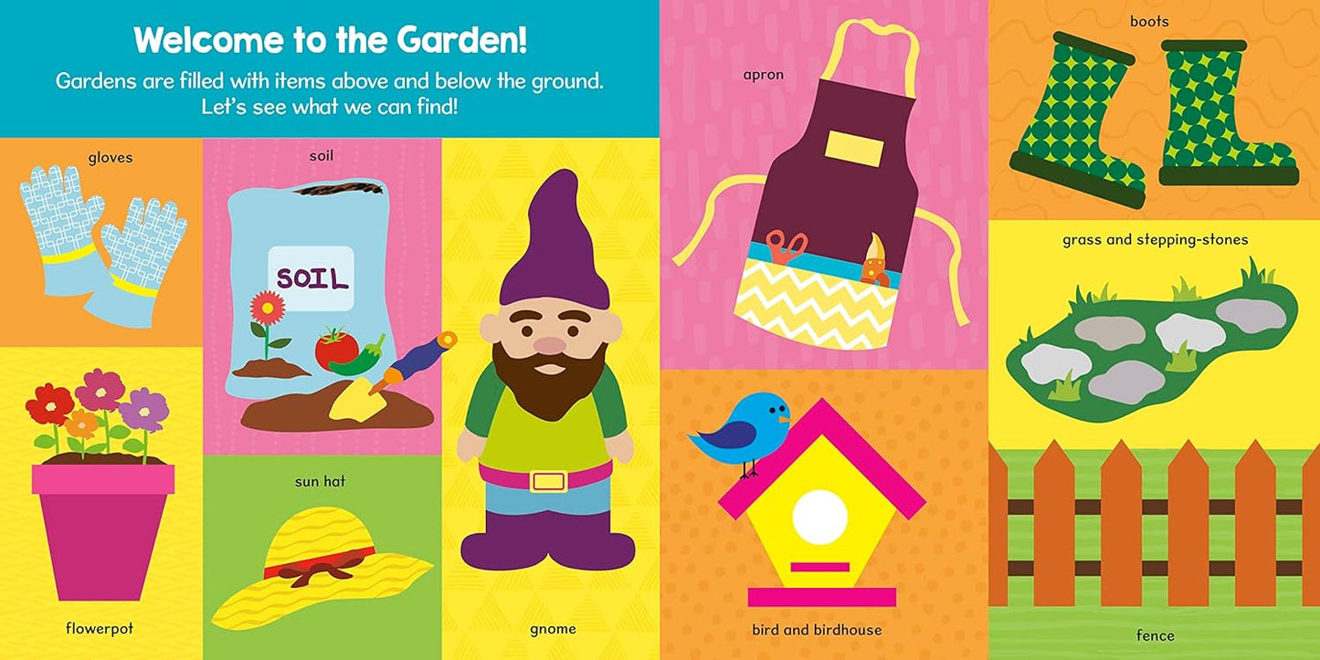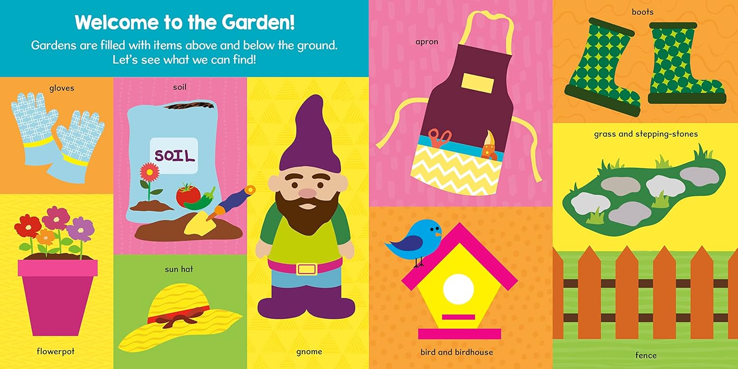 From bugs to tools, each page in this unique first words book is filled with things found in the garden--above and below the ground!