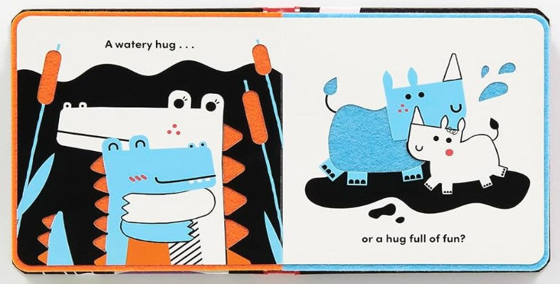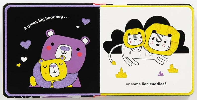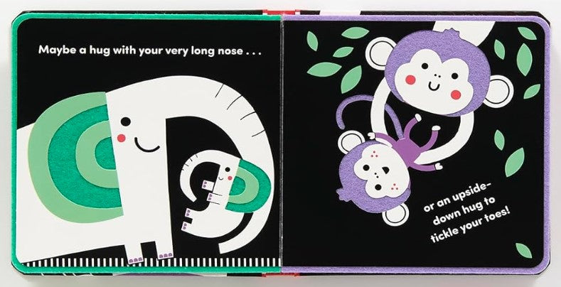 Cuddle up close with How Do You Hug?, a rhyming, high -contrast board book featuring die-cut shapes that peek through to soft felt pages.