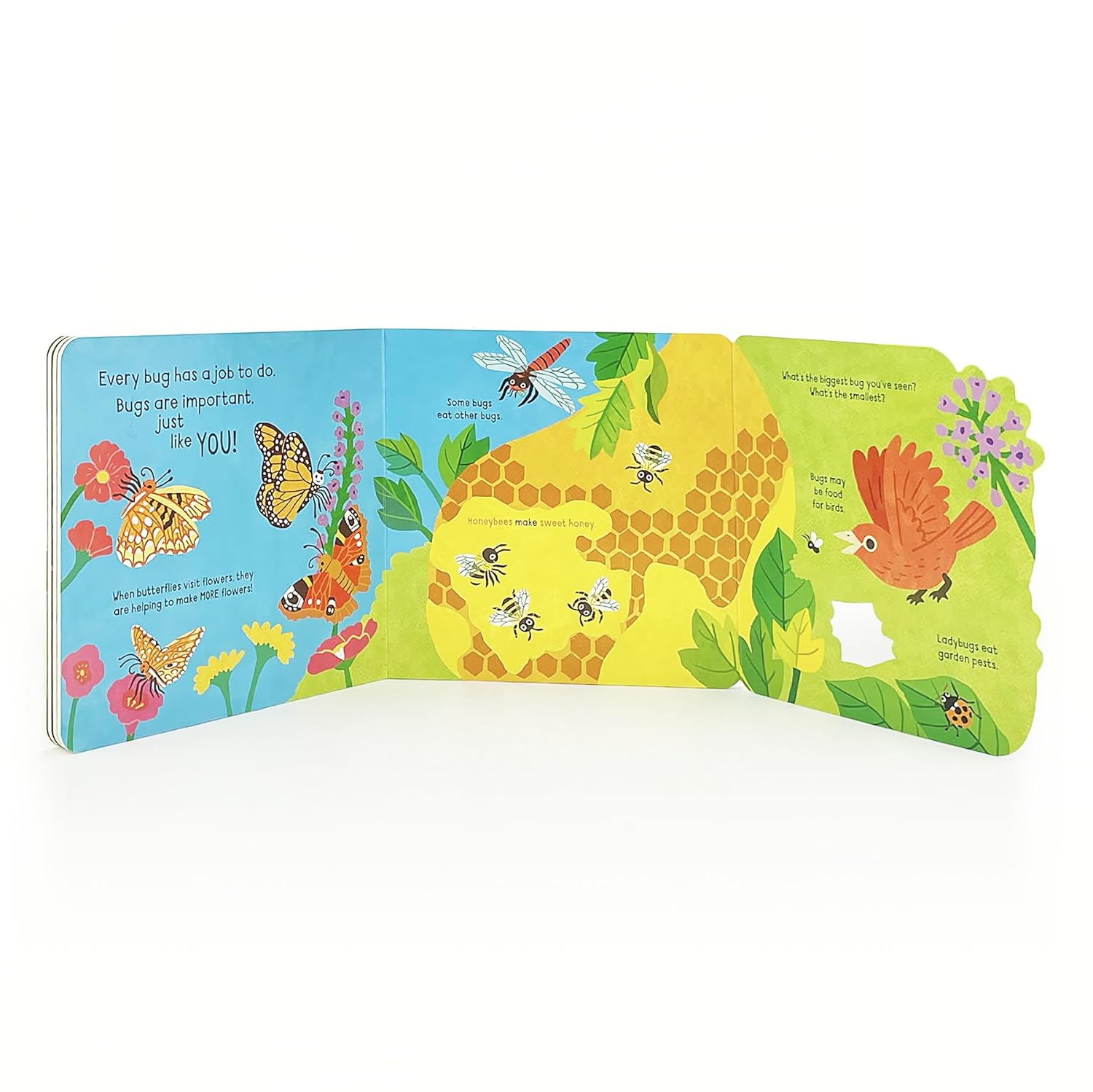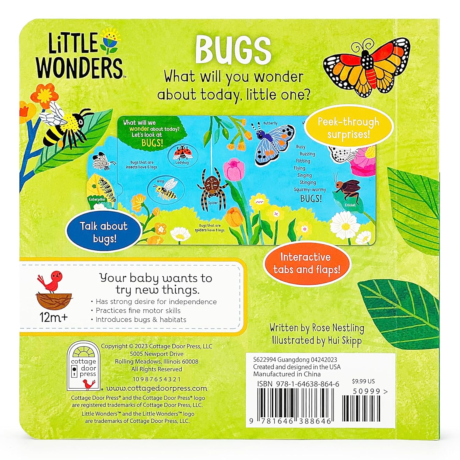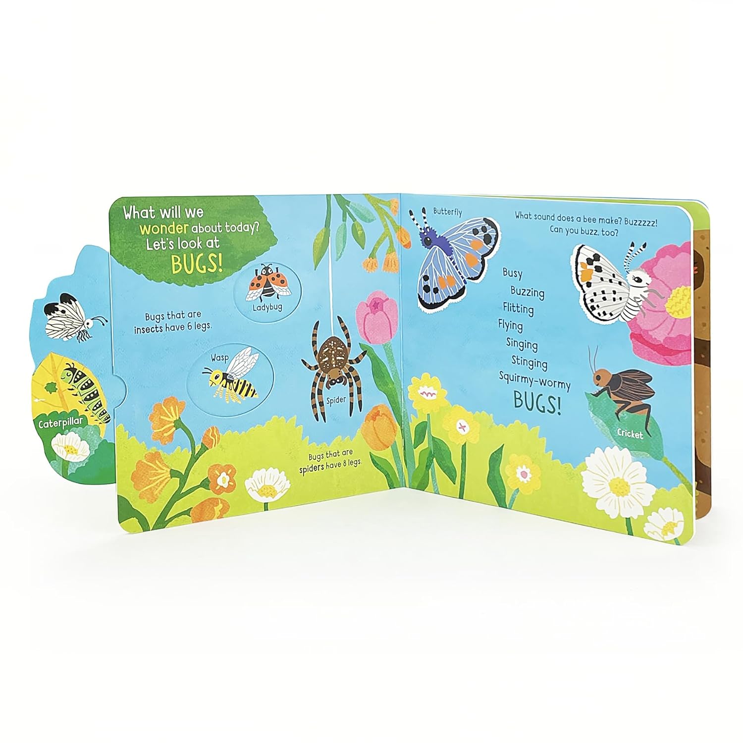 Your little one is full of wonder! Especially about bugs that are hopping, flying, squirming, and buzzing all around us! Help your baby or toddler discover and understand insects and spiders and what they do. Watch and listen but don't touch! Children who learn about nature grow up to care about nature. So go outside and learn to love butterflies and bees, spiders and worms, ants and crickets, and more. Bugs are wonderful!