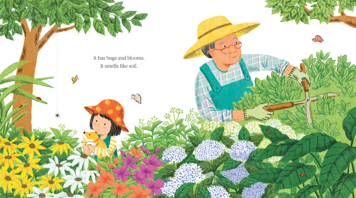 A young girl observes the bugs and blooms and the rich smell of the soil of her grandfather's garden. Her grandfather hums as he waters his treasured plants. And when he gives the girl a flower of her own, caring for it teaches her to feel her grandfather's love.