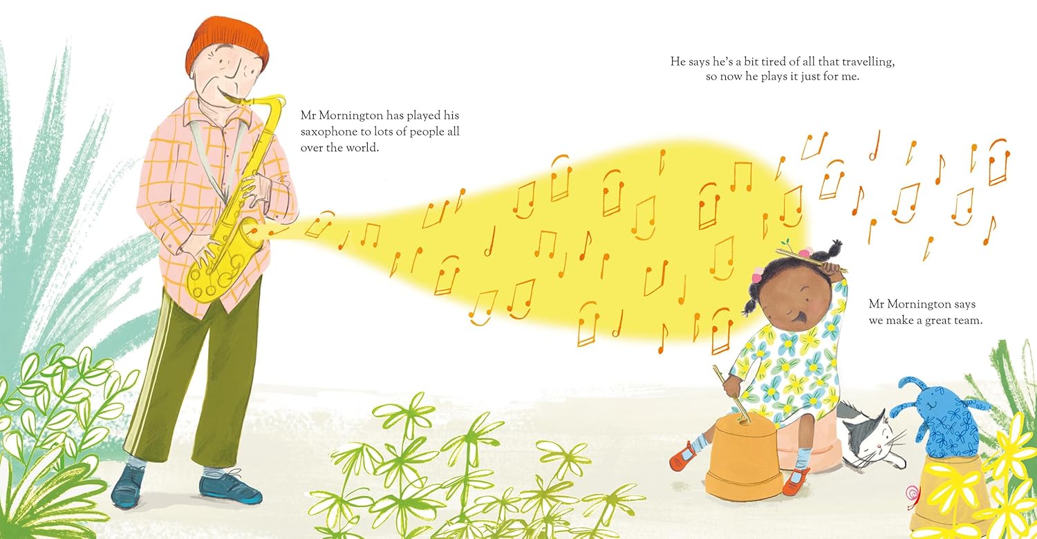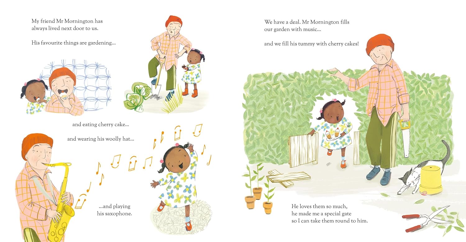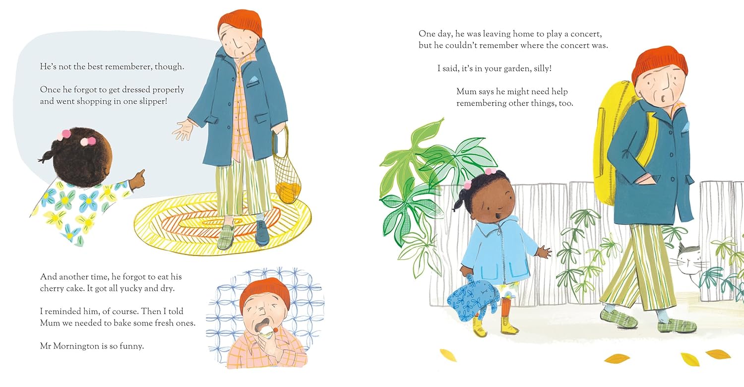 My friend Mr. Mornington has always lived next door to us. His favorite things are gardening and eating cherry cake and playing his saxophone. He's not the best rememberer, though.