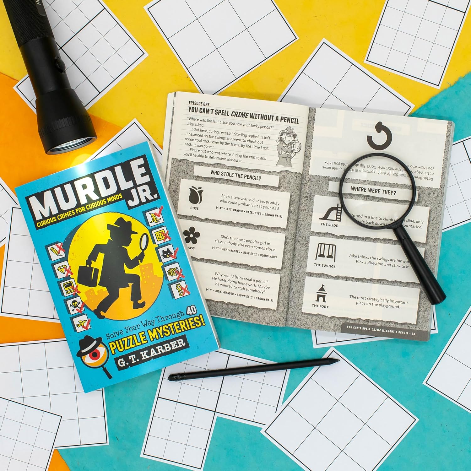 Stop what you're doing right now: There are mysteries to solve! Grab a pencil (and your wits) and step inside the puzzle-solving craze that's become an international sensation. From the ingenious mind of G.T. Karber comes a series of forty mini mysteries led by four junior detectives: tough-as-nails Jake, computer-whiz Olivia, quick-thinking Julius, and the un-fur-gettable Buster McPaws. Each aspiring detective investigates their own special case--with enough baffling suspects to confuse even the wisest sleuth.