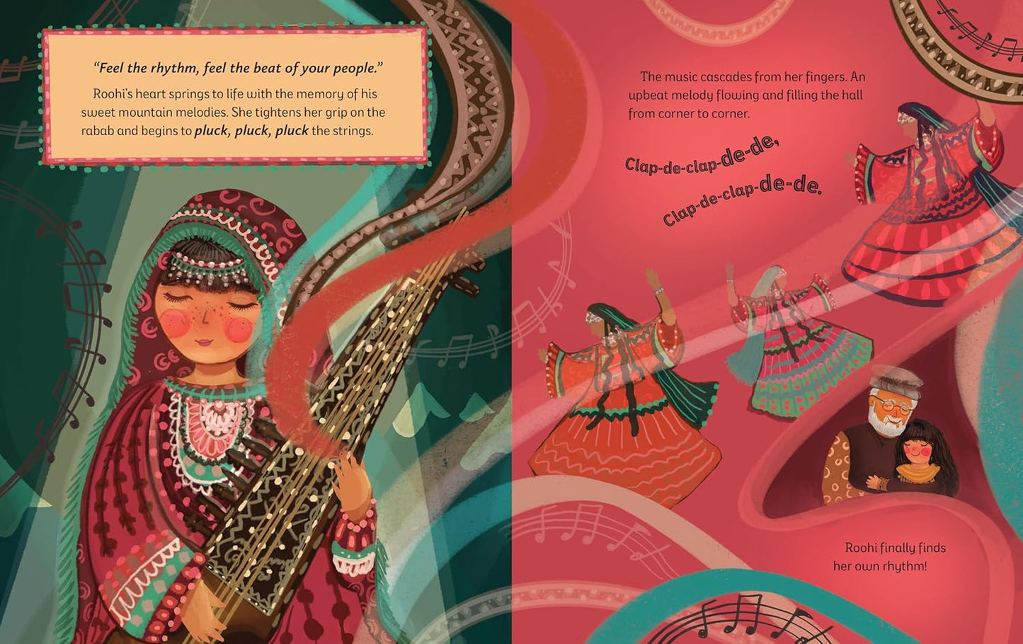 Roohi's most treasured time of the day is when she gets to listen to her grandfather play the rabab, the traditional stringed instrument of the Pashtun people. All she wants, more than anything in the world, is to be able to play songs full of rhythm like him. But even with lessons everyday, she sounds nothing like Neeka Baba's clap-de-clap-clap rhythm and beautiful melodies.