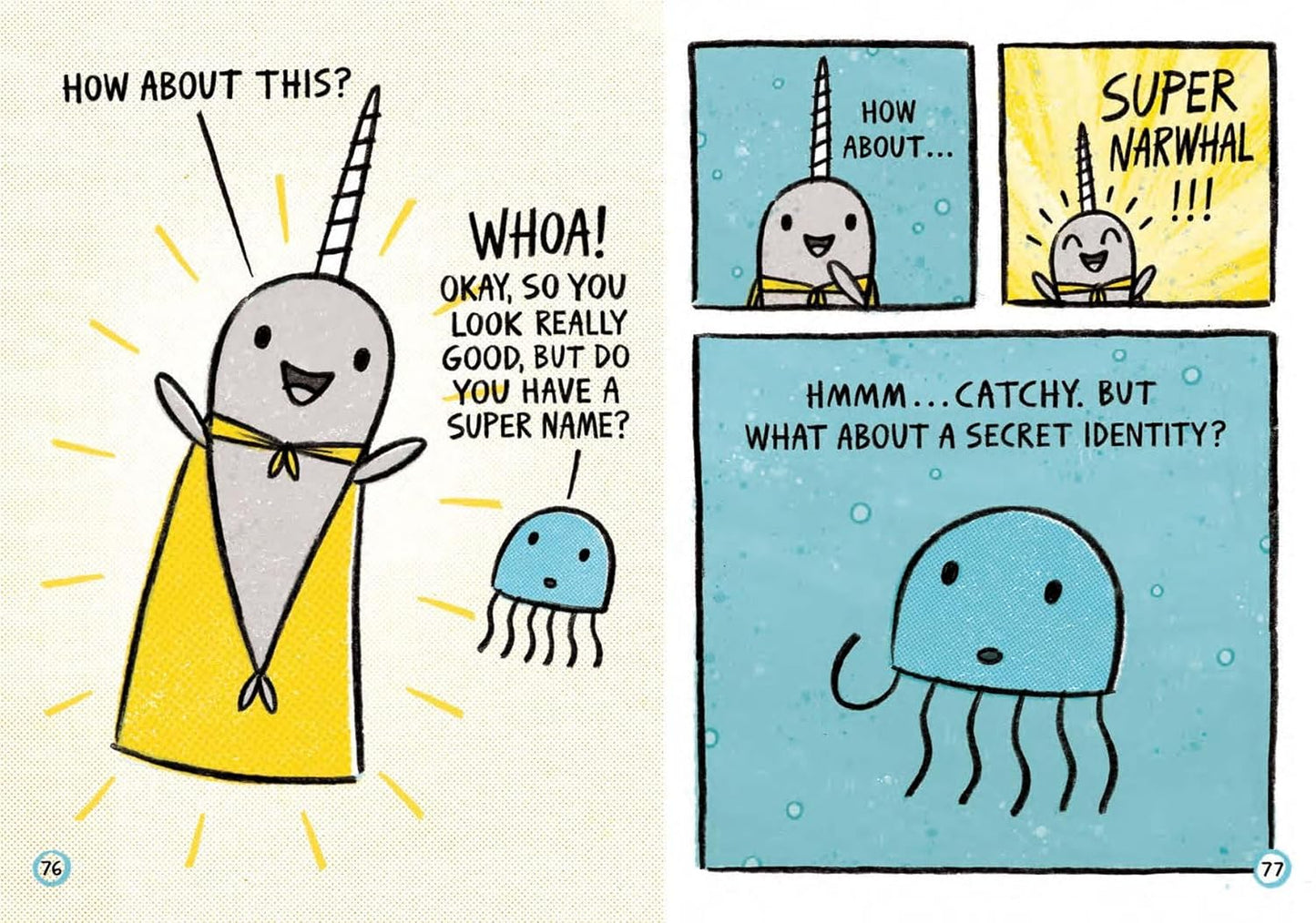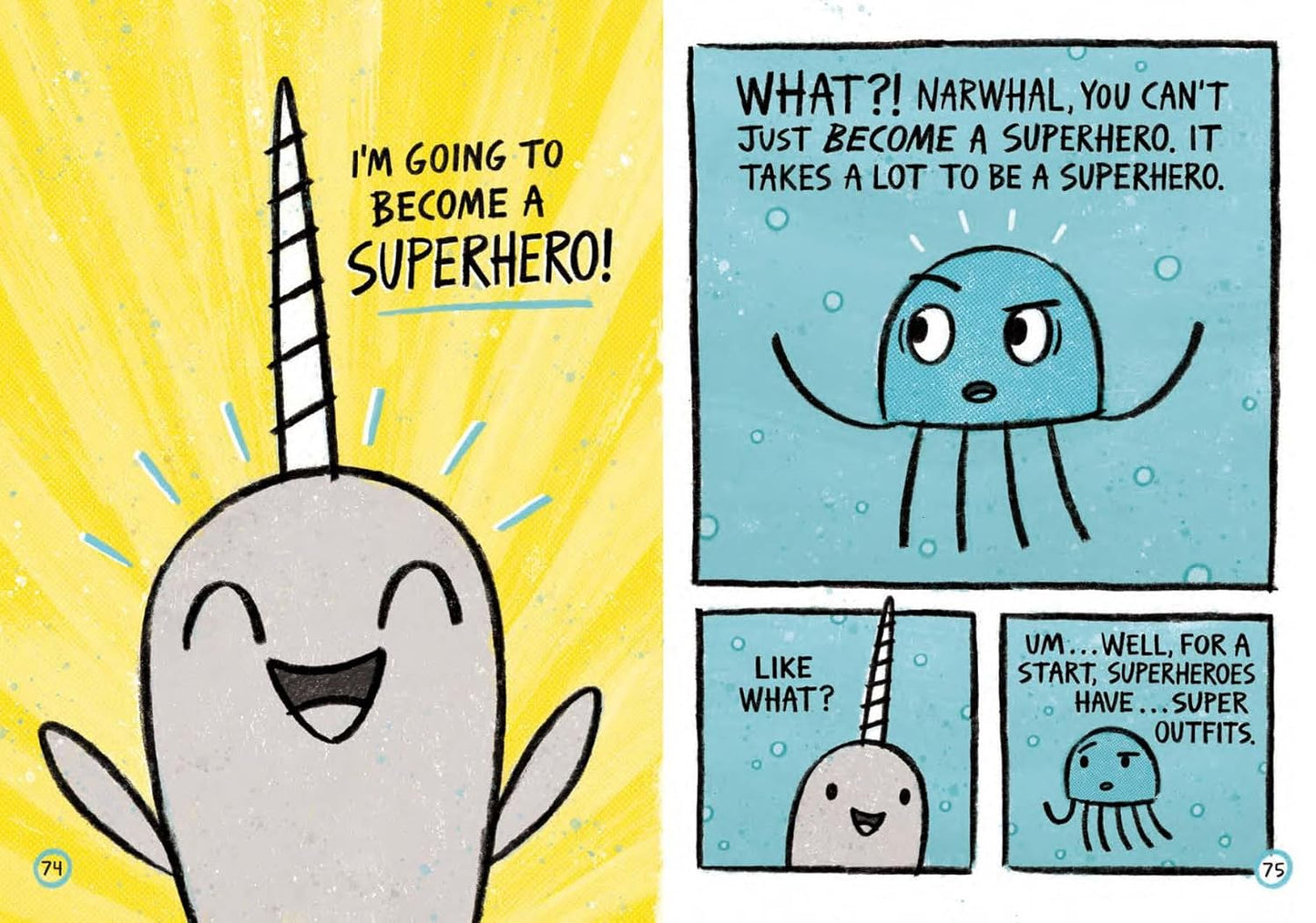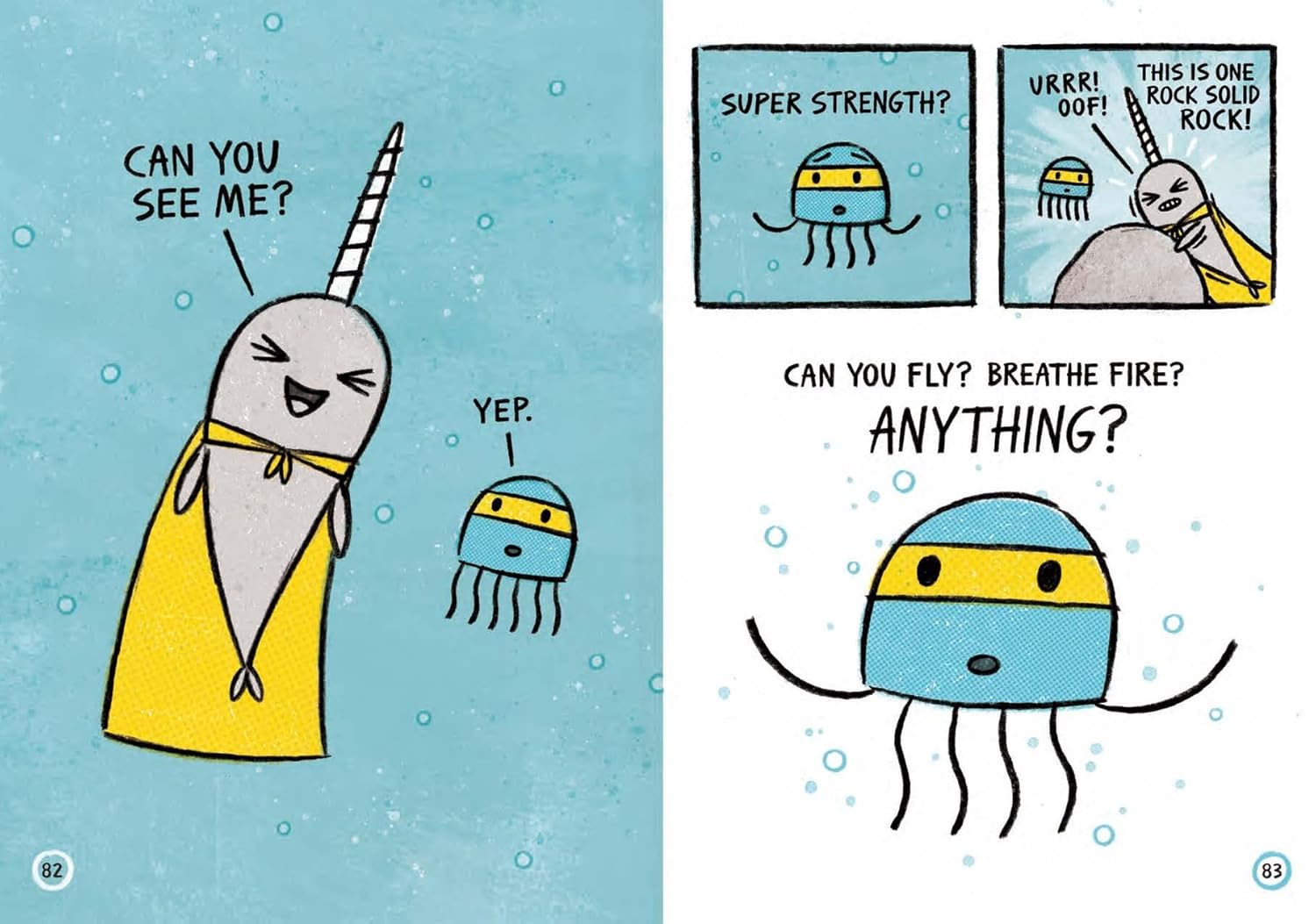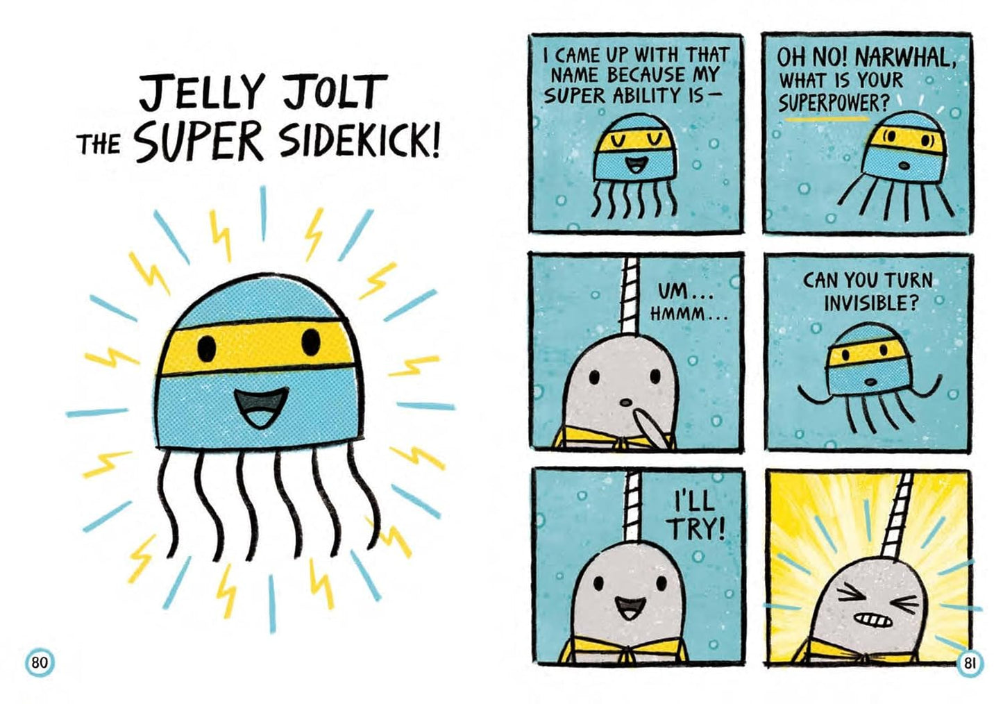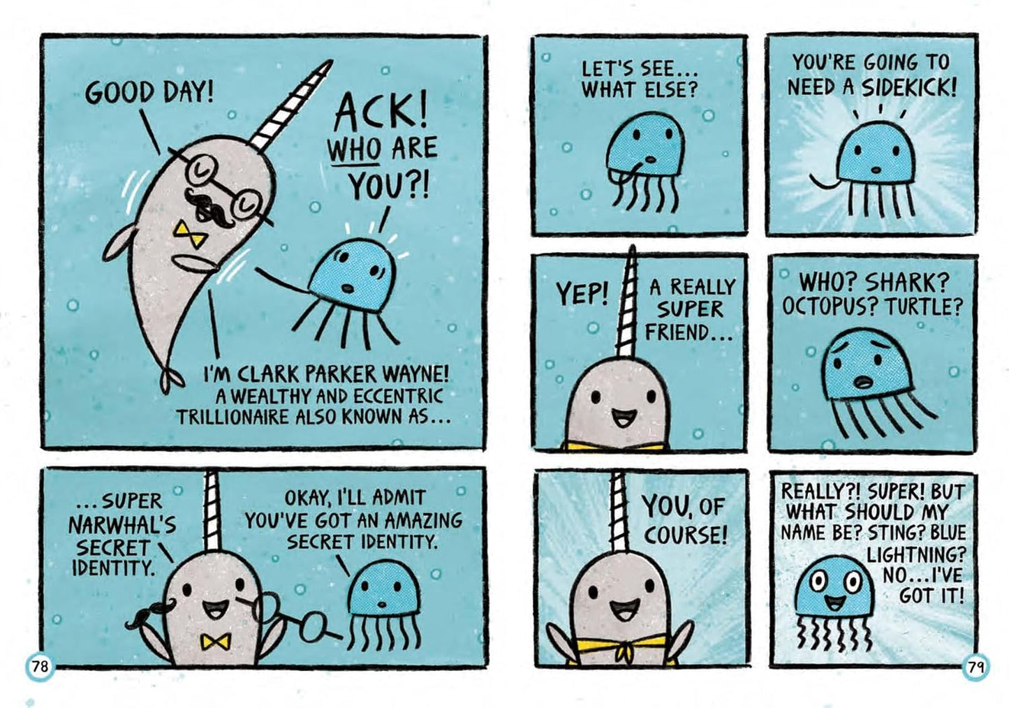 Happy-go-lucky Narwhal and no-nonsense Jelly find their inner superheroes in three new under-the-sea adventures. In the first story, Narwhal's superhero alter-ego is revealed, and Narwhal enlists Jelly to help figure out what their superpower is. Next, Narwhal helps a friend find his way back home. In the third story, Jelly is feeling blue and Narwhal comes to the rescue. Ben Clanton showcases the joys of friendship and the power of believing in yourself and others through this irresistible duo.
