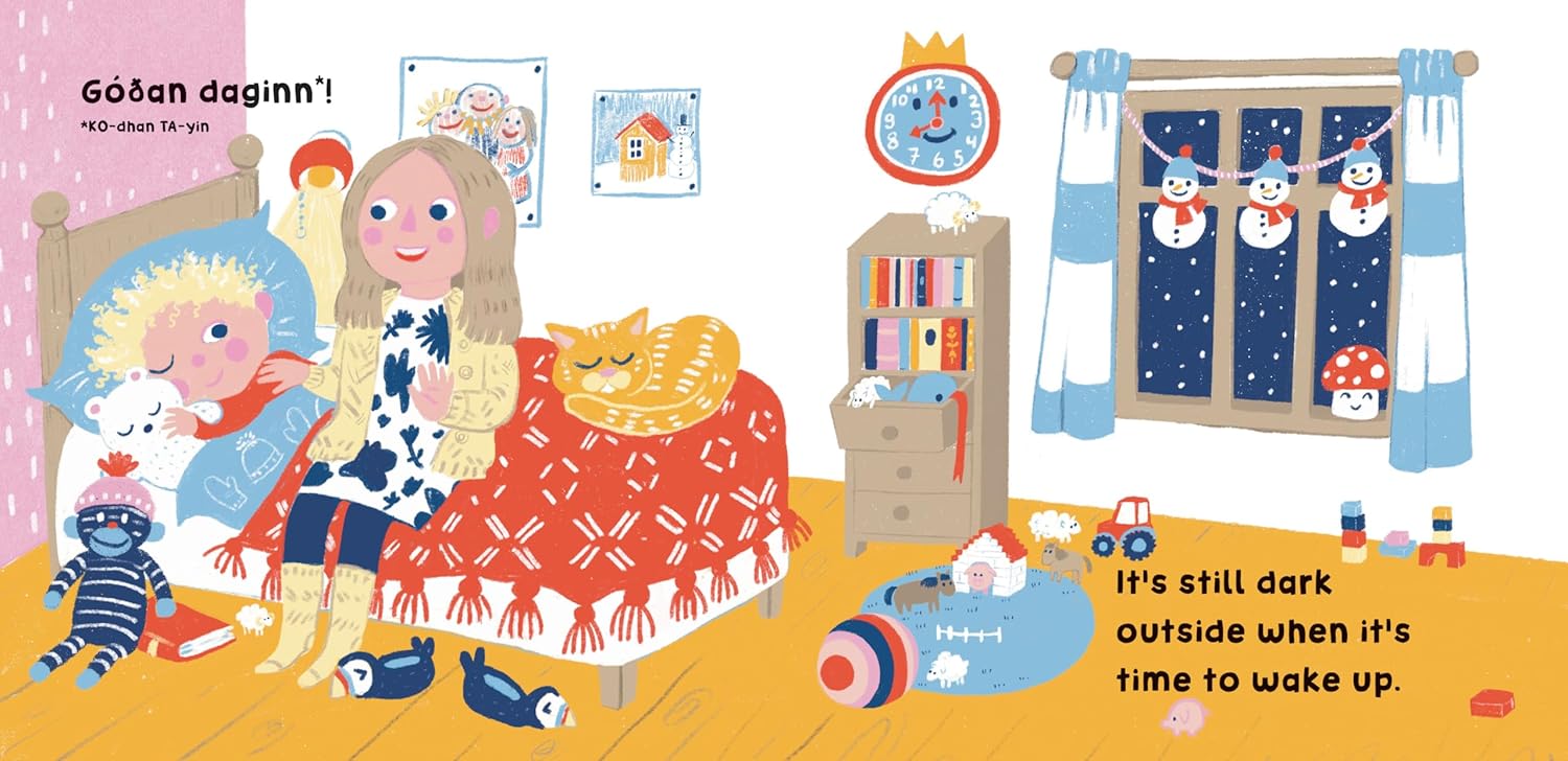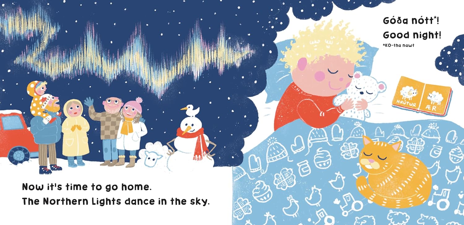Góðan daginn! Spend a day in Iceland eating hafragautur for breakfast, visiting the farm in the countryside, and driving past volcanoes and the northern lights. Even learn words in Icelandic with pronunciation guides throughout the story.