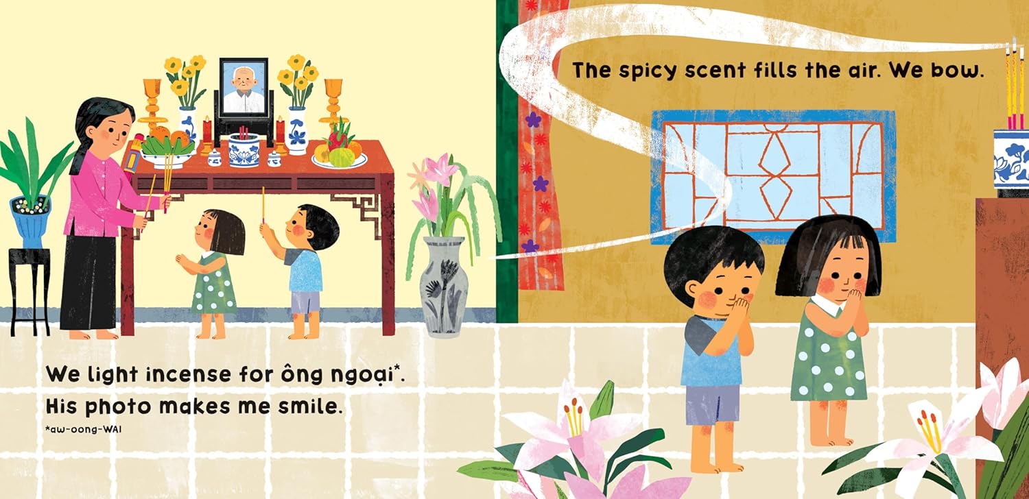 Chào buổi sáng! Spend a day in Vietnam eating steaming hot xôi and cơm with soup and veggies, lighting incense for ông ngoại, and buying fresh fruit at the market. Even learn words in Vietnamese with pronunciation guides throughout the story.