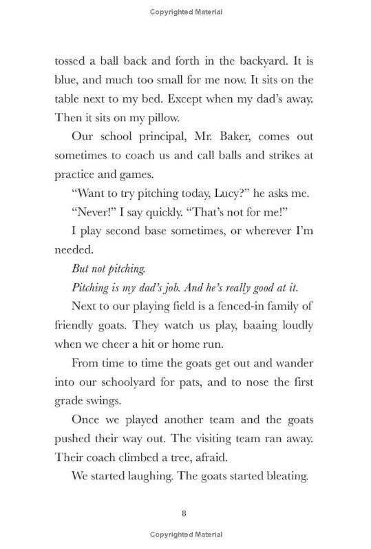 Lucy's father is a minor league baseball player, a professional pitcher hoping to get called up to the majors, and Lucy inherited his passion for the game. But she's never played pitcher. She worries her skills would be compared to her dad's and she'd never measure up. And his pitching may mean big things for his career and their family, but it's also what keeps him away from home so much of the year. Sometimes, Lucy isn't sure what would be worse: being bad at pitching or being great.