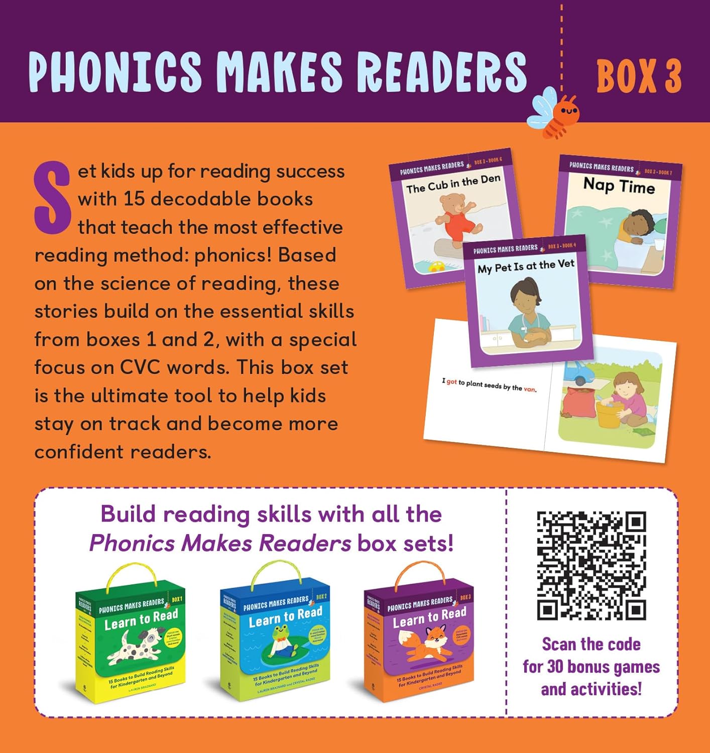 Based in the science of reading, this Phonics Makes Readers box set uses fun illustrations and simple, decodable language to help pre-K and kindergarten kids learn to read with confidence. Building on the skills introduced in box 1 and 2, this box includes 15 short, digestible stories like Bugs in a Jug, I Can Mop, and My Pet is at the Vet. Each one focuses on CVC words: three-letter words made up of a consonant-vowel-consonant combination--like "cat" and "big"--that are essential for beginning readers as they learn to blend letter sounds.