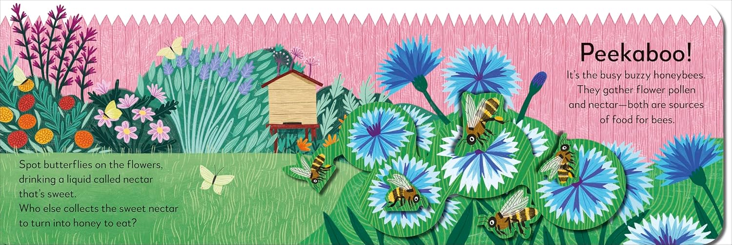 Babies and toddlers will love lifting the big flaps to find five peekaboo surprises pop up from the pages: a bright yellow sunflower growing taller and taller, busy honeybees gathering nectar and pollen, a spotty ladybird on a strawberry plant flower, a frog jumping across some waterlilies, and a cheery sparrow chirping in a cherry tree. Vocabulary about animal habitats is carefully woven throughout, making this board book a fun and easy story about gardens.