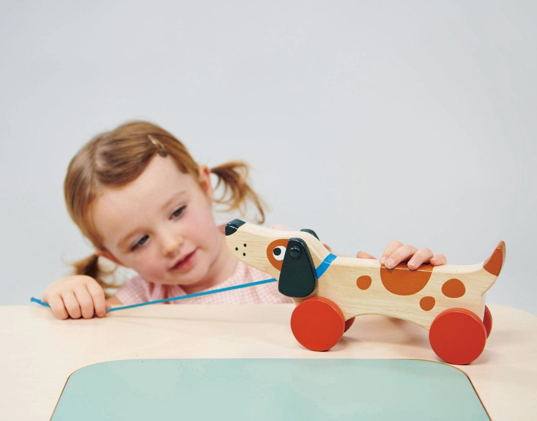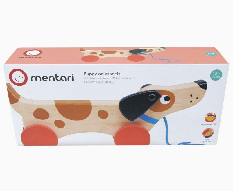 This toy puppy comes with a cord for pulling, red wheels, and rotating ears.
