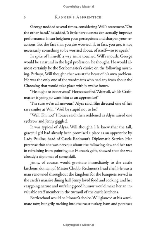 "They have always scared him in the past--the Rangers, with their dark cloaksand shadowy ways. The villagers believe the Rangers practice magic that makes them invisible to ordinary people. And now 15-year-old Will, always small for his age, has been chosen as a Ranger's apprentice. What he doesn't yet realize is that the Rangers are the protectors of the kingdom. Highly trained in the skills of battle and surveillance, they fight the battles before the battles reach the people. And as Will is about to learn, there is a large battle brewing. The exiled Morgarath, Lord of the Mountains of Rain and Night, is gathering his forces for an attack on the kingdom. This time, he will not be denied...."