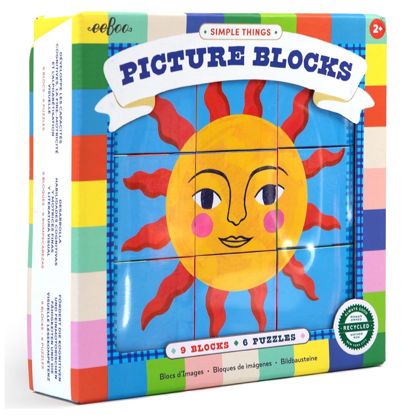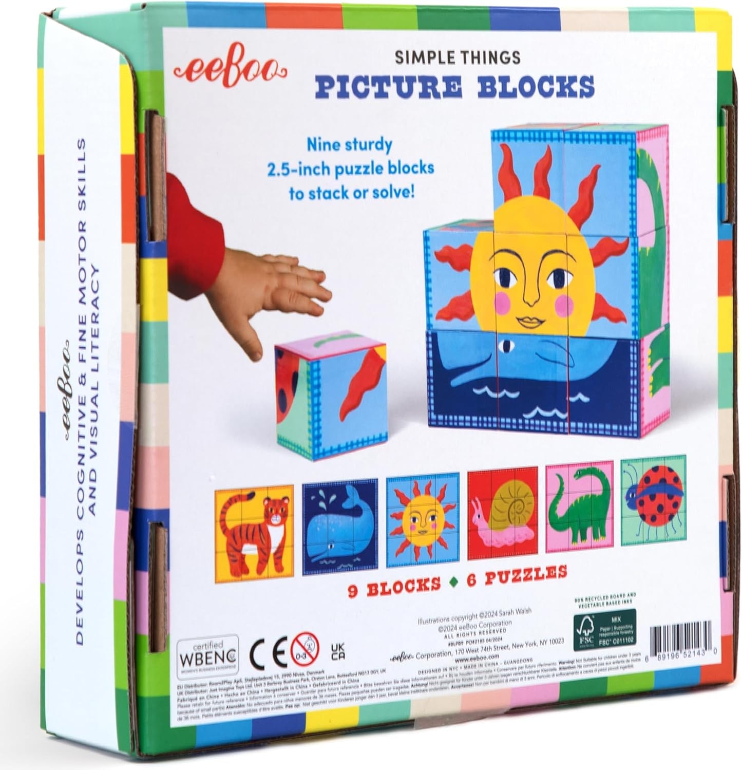 Six simple puzzles in a 9-block set featuring vibrant, stackable art by Sarah Walsh. Includes color insert for reference.