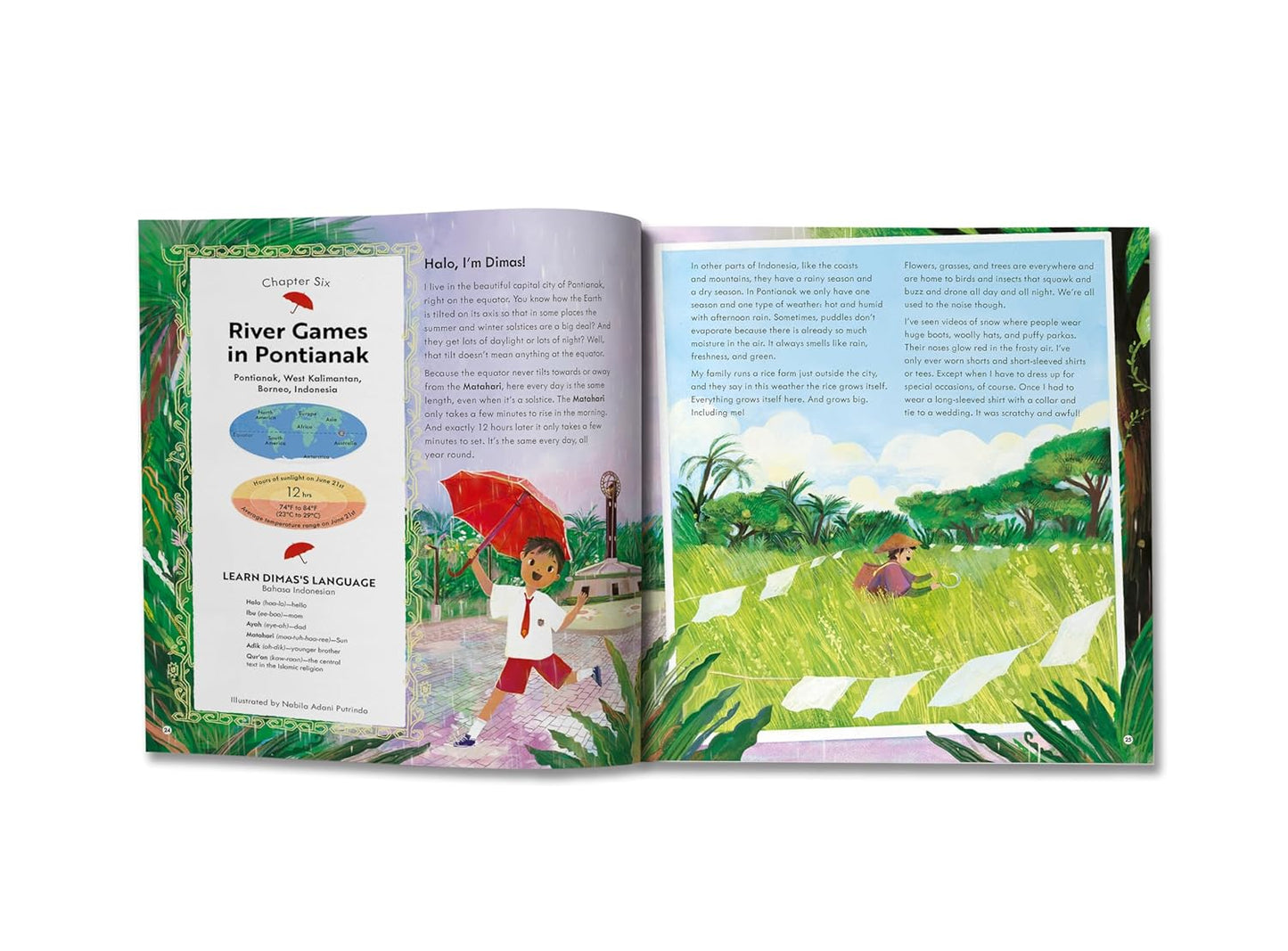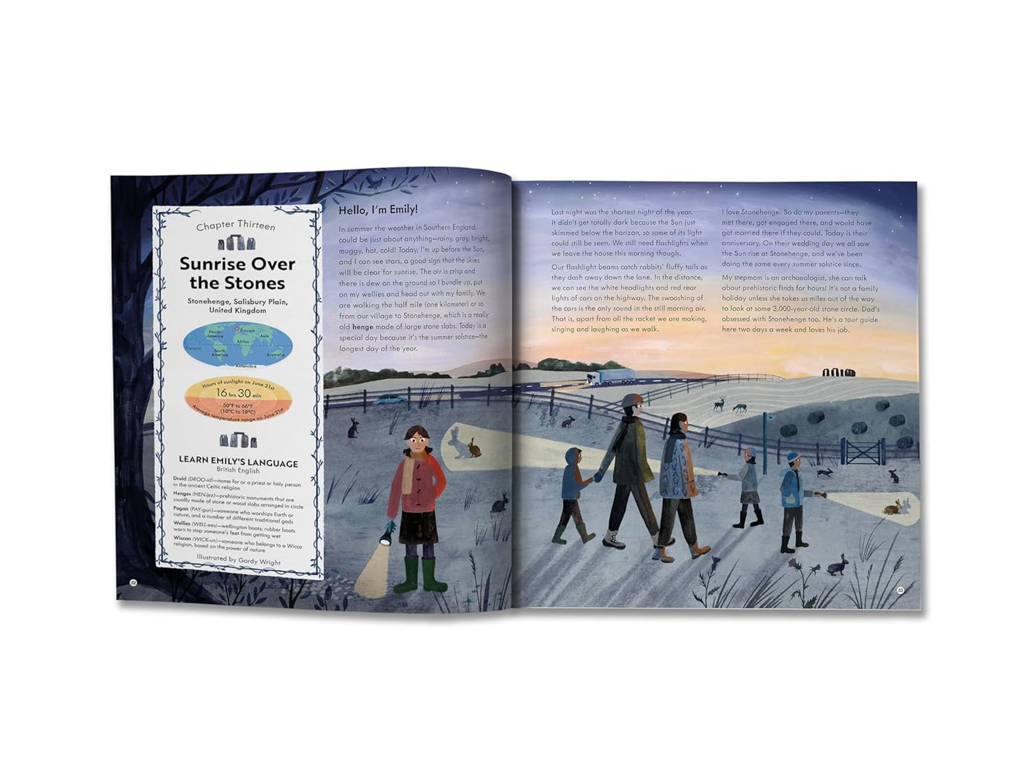 Every year, during the June solstice, the Earth tilts towards the Sun, creating either the longest or shortest day of the year. Across the world, people celebrate this day in different ways, from bonfires and banquets to firework festivals and ancient rituals. In this book, you will celebrate the solstice alongside 14 fictional characters from 14 real places around the world. You will be transported to Antarctica, Argentina, Australia, South Africa, Ecuador, Indonesia, Nigeria, Nepal, Morocco, China, Turkey, America, the United Kingdom, and Norway. Each account is both a personal story and an informative narrative, full of cultural insight, geographical information, and words from each native language. Meanwhile, specially commissioned artwork, by illustrators from each place, bring familiarity and warmth to every page.