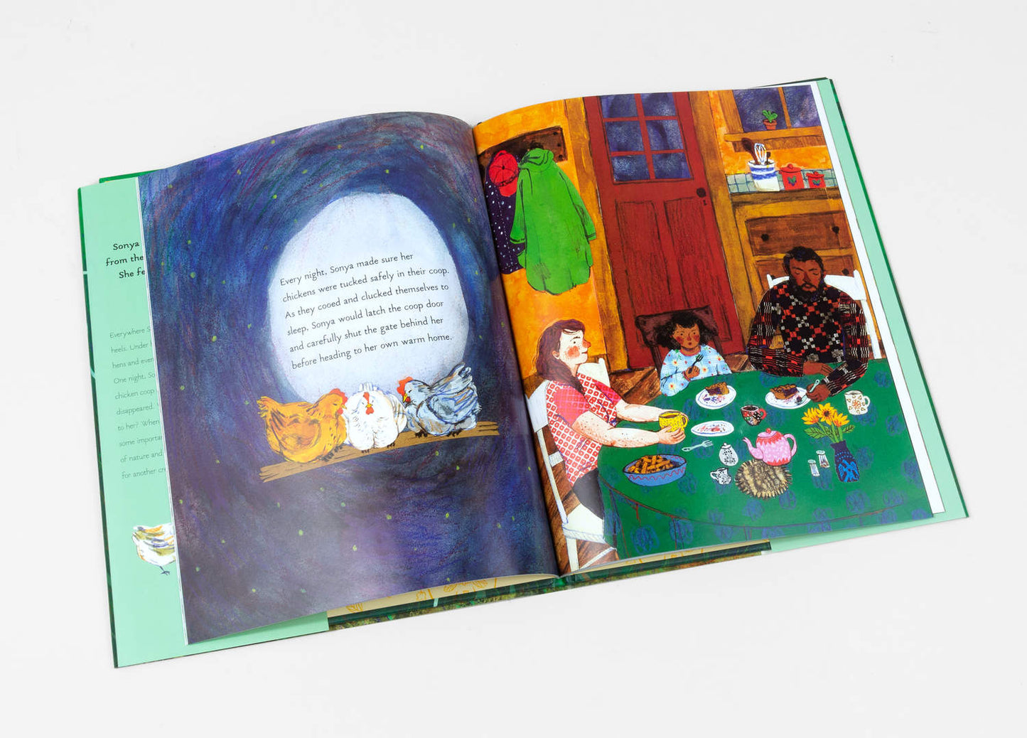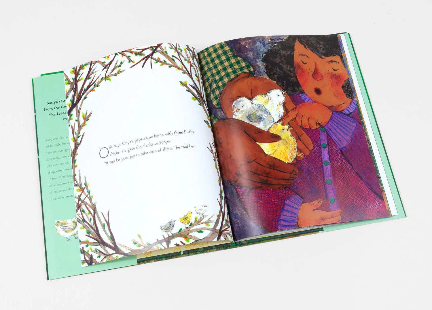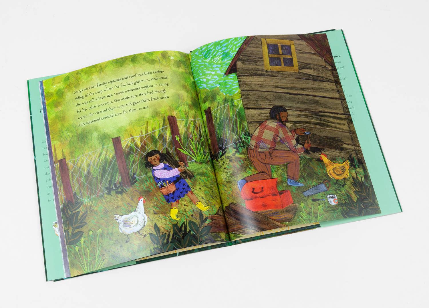"Sonya raises her three chickens from the time they are tiny chicks. She feeds them, shelters them and loves them. Everywhere Sonya goes, her chicks are peeping at her heels. Under her care, the chicks grow into hens and even give Sonya a wonderful gift: an egg! One night, Sonya hears noises coming from the chicken coop and discovers that one of her hens has disappeared. Where did the hen go? What happened to her? When Sonya discovers the answers, she learns some important truths about the interconnectedness of nature and the true joys and sorrows of caring for another creature."