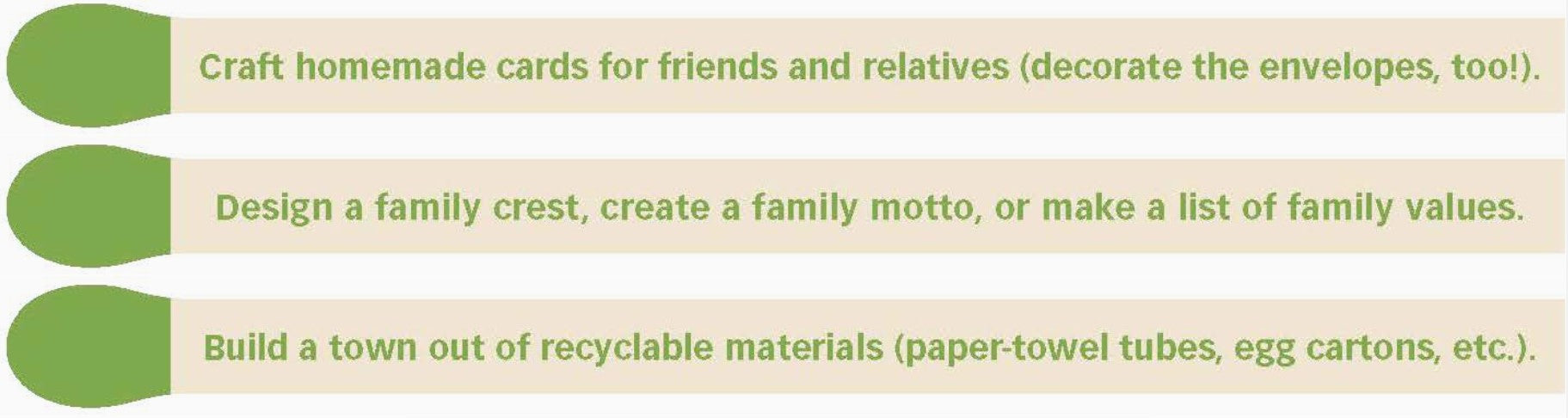 - Put together a family cookbook of best-loved recipes; add drawings or photos.