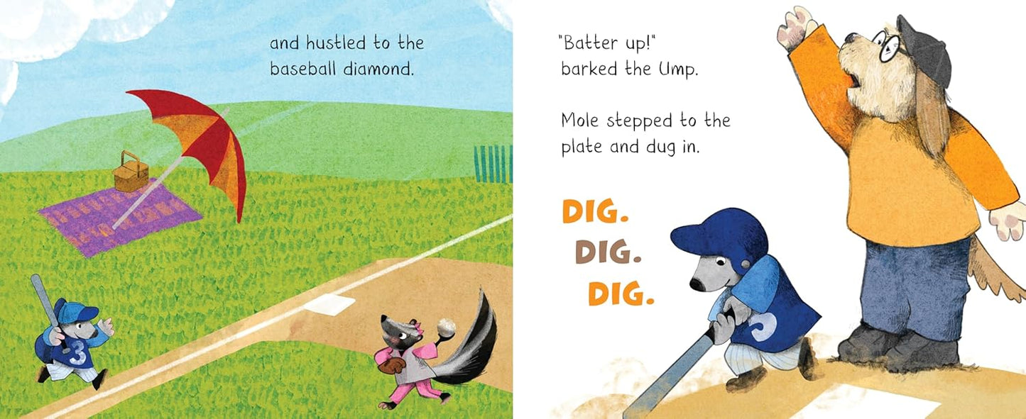 Finally, summer is here! Baseball-loving Mole suits up and hustles to the baseball diamond for a game with his best friend Bear. Mole is ready to play, and he's swinging for the fences! Swish. Swish. Swish. It's a swing and... a miss?