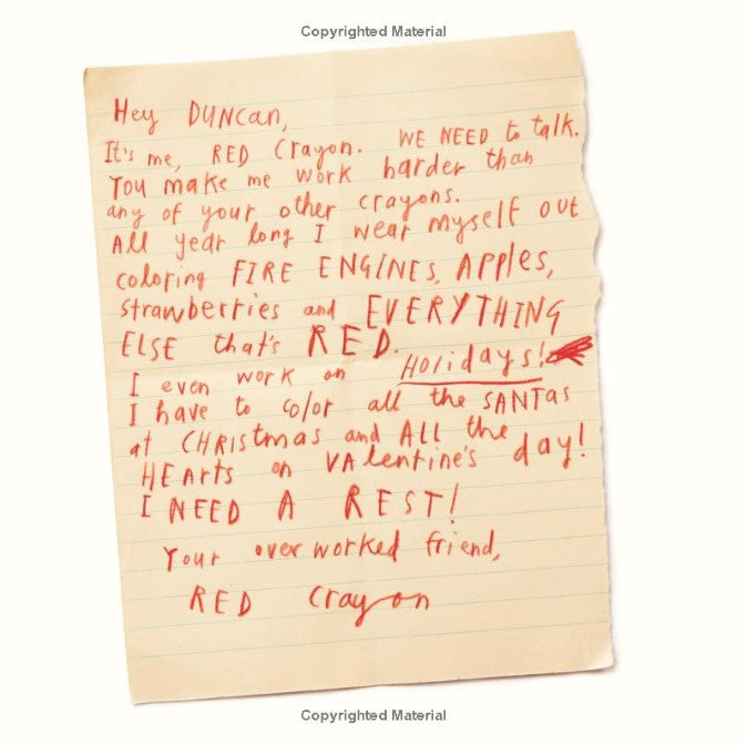 "Poor Duncan just wants to color. But when he opens his box of crayons, he finds only letters, all saying the same thing: His crayons have had enough! They quit! Blue crayon needs a break from coloring all those bodies of water. Black crayon wants to be used for more than just outlining. And Orange and Yellow are no longer speaking--each believes he is the true color of the sun. What can Duncan possibly do to appease all of the crayons and get them back to doing what they do best?"