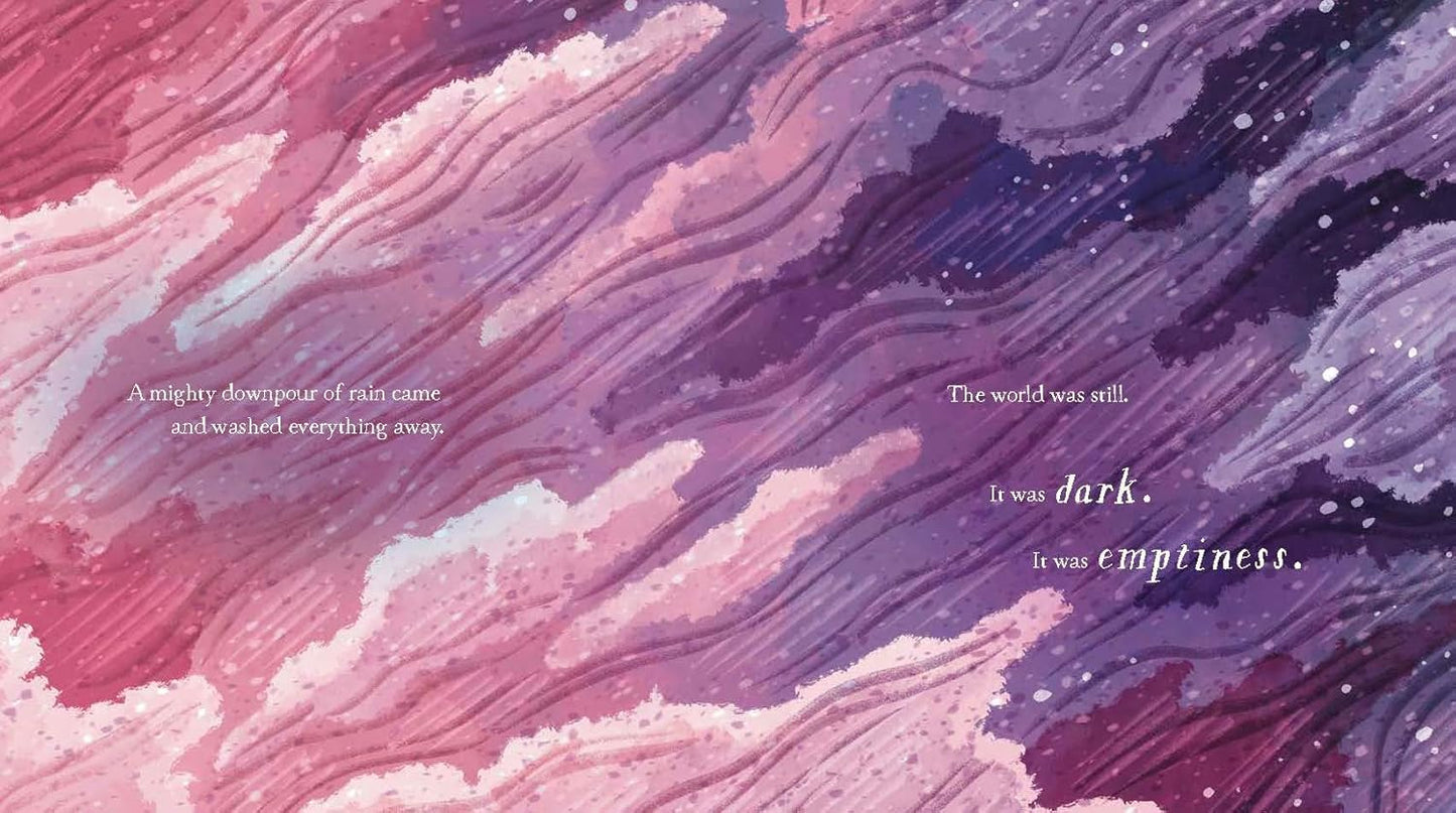 From a mound of simple dirt, through magic and intention, the world we know today slowly takes shape across the page.