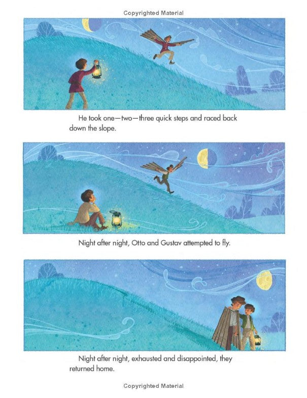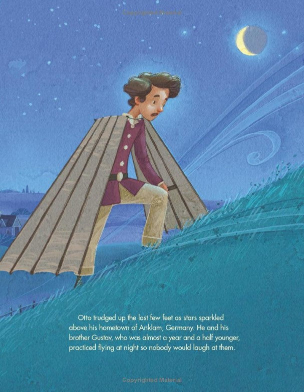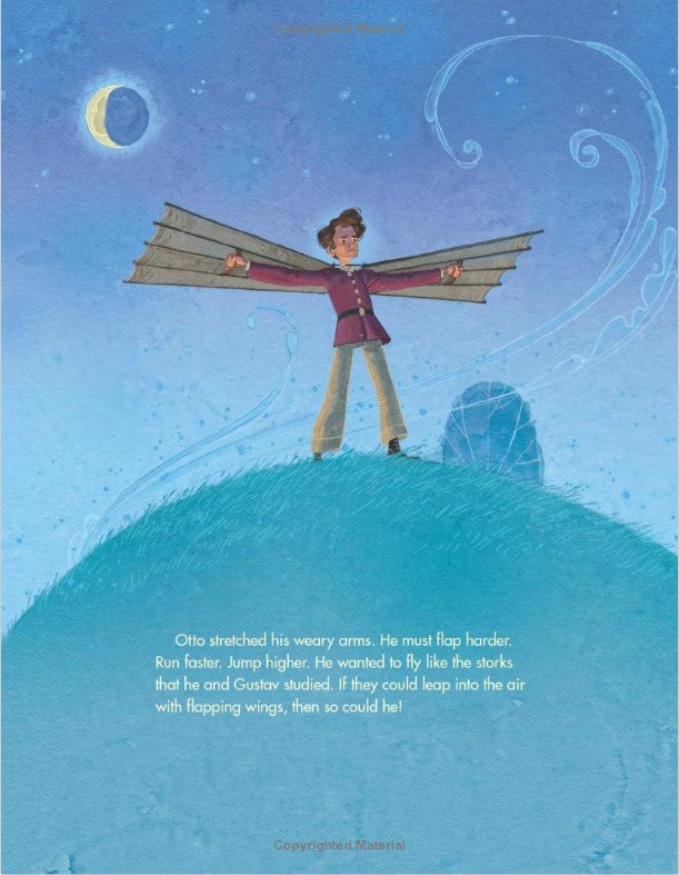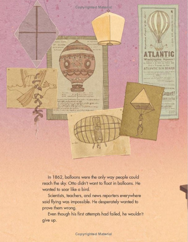In 1862, balloons were the only way to reach the sky. But 14-year-old Otto Lilienthal didn't want to fly in balloons. He wanted to soar like a bird. Scientists, teachers, and news reporters everywhere said flying was impossible. Otto and his brother Gustav desperately wanted to prove them wrong, so they made their own wings and tried to take flight. The brothers quickly crashed, but this was just the beginning for Otto, who would spend the next 30 years of his life sketching, re-sketching, and building gliders.