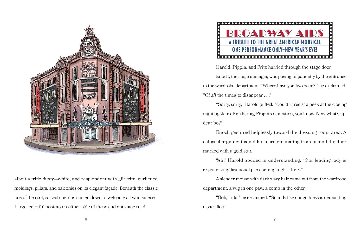 In this secret space, an adorable troupe of theater mice busily prepare to stage their own show, Broadway Airs. Among the cast and crew are Emil, the director; Harold, the character actor; Adelaide, the diva; and young Pippin, the intern. Rehearsals are in their usual state of chaos when suddenly the production is threatened by the imminent demolition of the theater and the devastating disappearance of Adelaide.