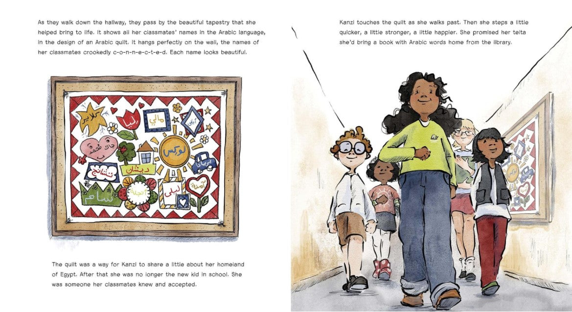 Aya Khalil appends a note about how The Arabic Quilt was briefly banned from the York, Pennsylvania school system, and the backmatter also includes a recipe for baklawa, the Egyptian pastry that Kanzi prepares for the bake sale.