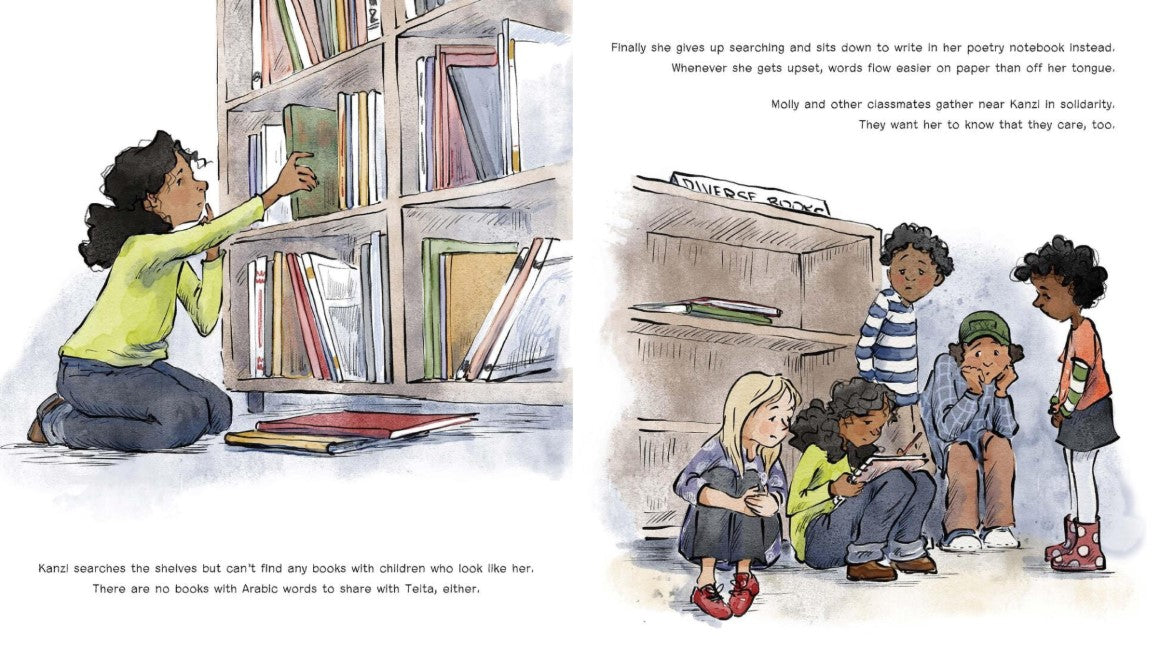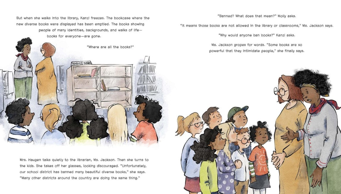 "Upon learning that the books with kids who look like her have been banned by her school district, Kanzi descends into fear and helplessness. But her classmates support her, and together--with their teacher's help--they hatch a plan to hold a bake sale and use the proceeds to buy diverse books to donate to libraries. The event is a big success; the entire school participates, and the local TV station covers it in the evening news. Prodded by her classmates to read the poem she has written, Kanzi starts softly but finds her voice. "You have banned important books, but you can't ban my words," she reads. "Books are for everyone." The crowd chants, "No banned books! No banned books!" and the next week, the ban is reversed."
