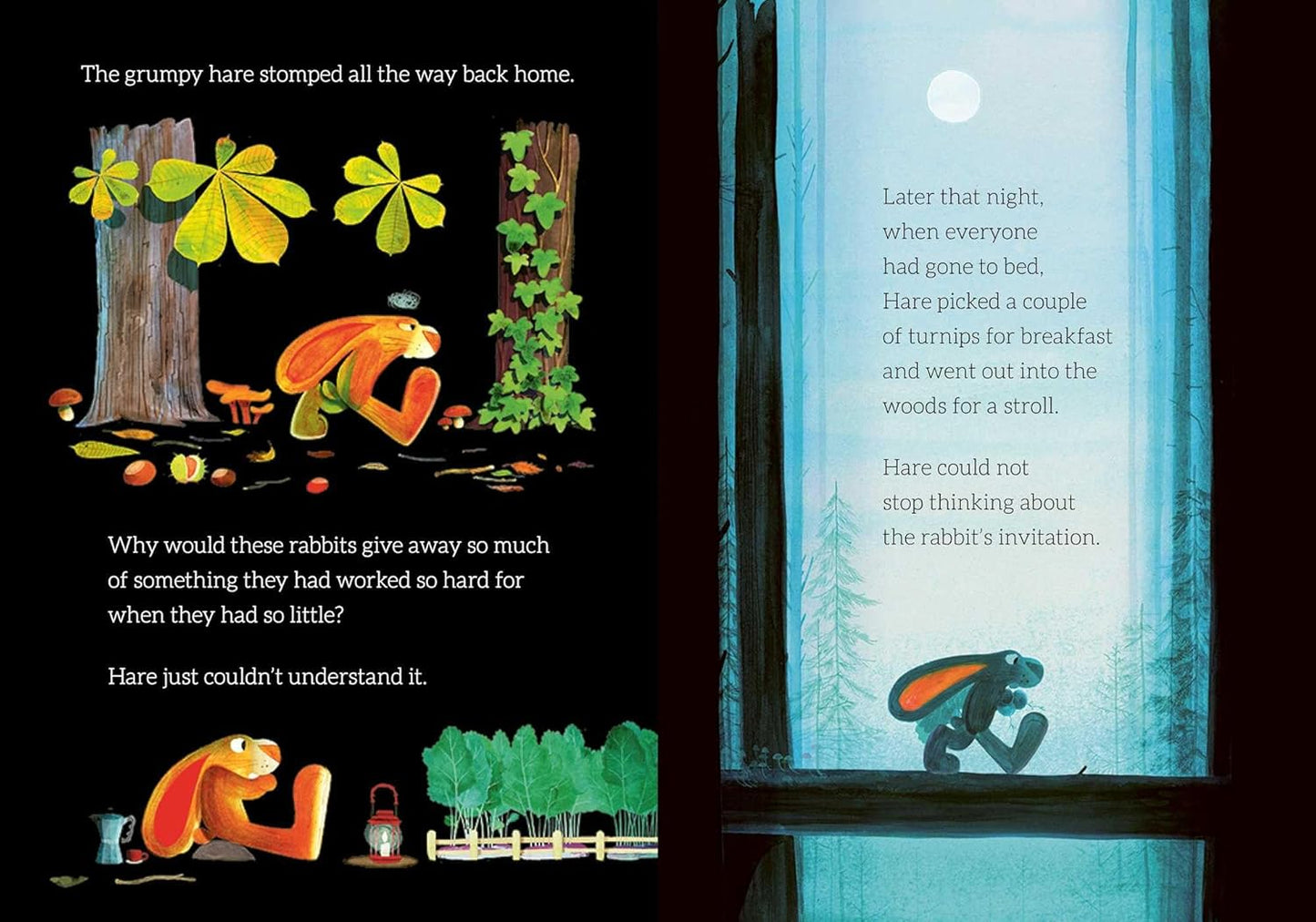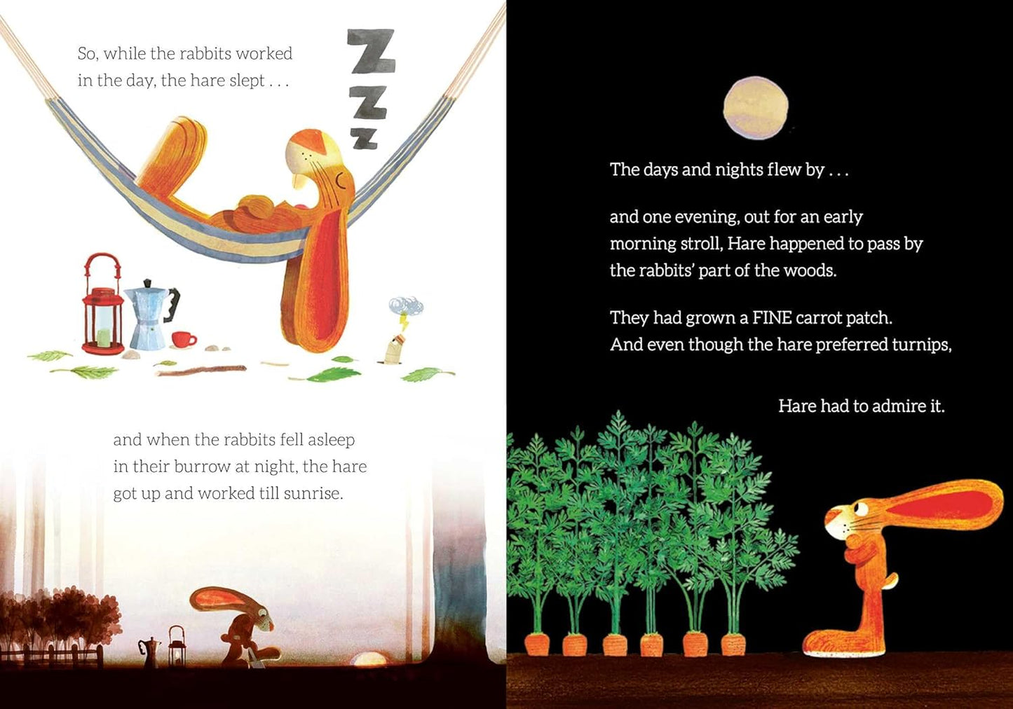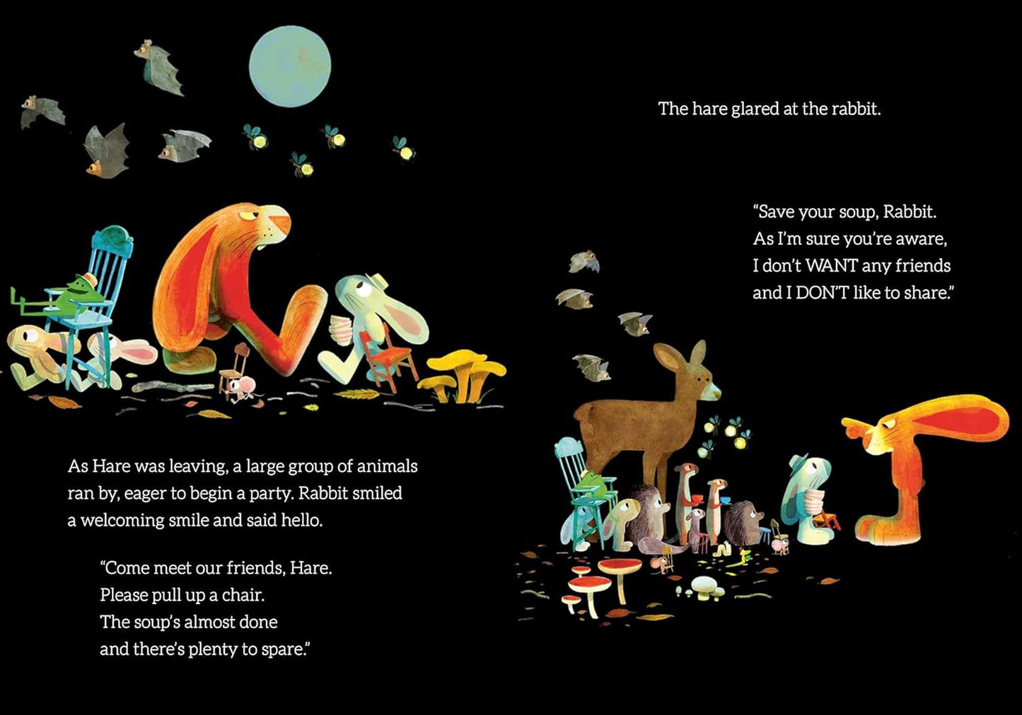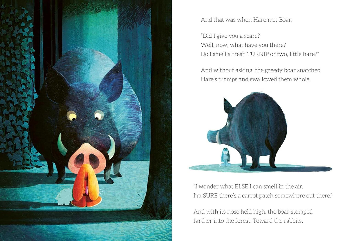 "Hare is proud of his turnip patch and doesn't want to share it with anyone. When the rabbits move in nearby, they invite Hare for carrot soup but he's much happier being alone. Still, when a huge boar comes to the woods in search of his next meal, Hare feels he should warn his neighbors. Can they find a way to help each other stay out of danger?"